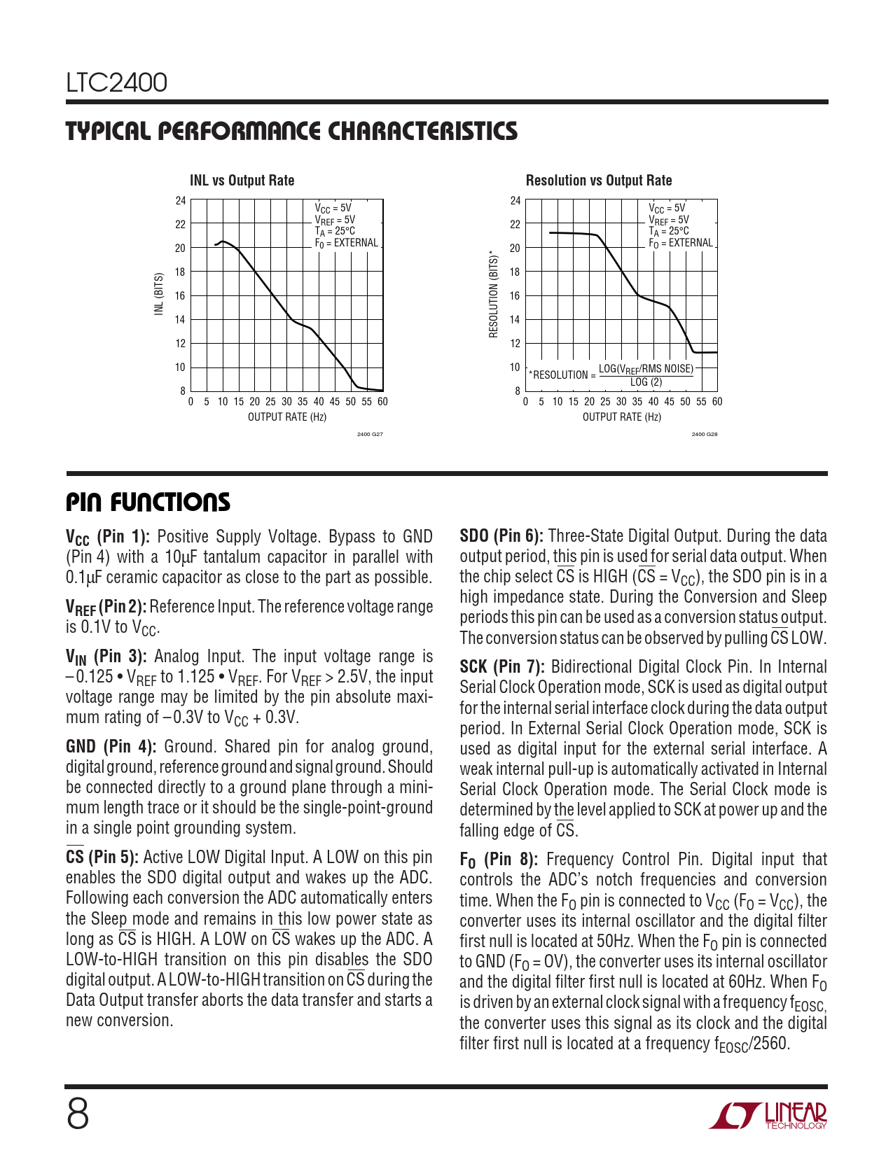 TYPICAL PERFOR A CE CHARACTERISTICS. INL vs Output Rate. Resolution vs Output Rate. PIN FUNCTIONS. VCC (Pin 1):. SDO (Pin 6):
