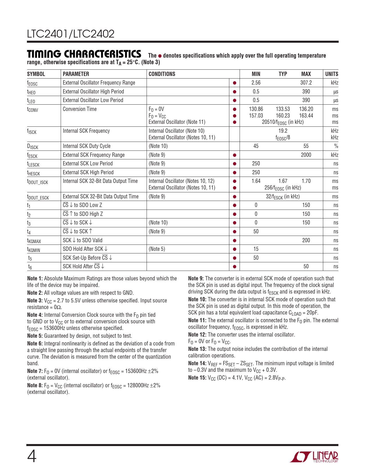 LTC2401/LTC2402 W UTI I G CHARACTERISTICS The ● denotes specifications which apply over the full operating temperaturerange, otherwise specifications are at TA = 25 ° C. (Note 3)SYMBOLPARAMETERCONDITIONSMINTYPMAXUNITS fEOSC External Oscillator Frequency Range ● 2.56 307.2 kHz tHEO External Oscillator High Period ● 0.5 390 µs tLEO External Oscillator Low Period ● 0.5 390 µs tCONV Conversion Time FO = 0V ● 130.86 133.53 136.20 ms FO = VCC ● 157.03 160.23 163.44 ms External Oscillator (Note 11) ● 20510/fEOSC (in kHz) ms fISCK Internal SCK Frequency Internal Oscillator (Note 10) 19.2 kHz External Oscillator (Notes 10, 11) fEOSC/8 kHz DISCK Internal SCK Duty Cycle (Note 10) 45 55 % fESCK External SCK Frequency Range (Note 9) ● 2000 kHz tLESCK External SCK Low Period (Note 9) ● 250 ns tHESCK External SCK High Period (Note 9) ● 250 ns tDOUT_ISCK Internal SCK 32-Bit Data Output Time Internal Oscillator (Notes 10, 12) ● 1.64 1.67 1.70 ms External Oscillator (Notes 10, 11) ● 256/fEOSC (in kHz) ms tDOUT_ESCK External SCK 32-Bit Data Output Time (Note 9) ● 32/fESCK (in kHz) ms t1 CS ↓ to SDO Low Z ● 0 150 ns t2 CS ↑ to SDO High Z ● 0 150 ns t3 CS ↓ to SCK ↓ (Note 10) ● 0 150 ns t4 CS ↓ to SCK ↑ (Note 9) ● 50 ns tKQMAX SCK ↓ to SDO Valid ● 200 ns tKQMIN SDO Hold After SCK ↓ (Note 5) ● 15 ns t5 SCK Set-Up Before CS ↓ ● 50 ns t6 SCK Hold After CS ↓ ● 50 ns Note 1: Absolute Maximum Ratings are those values beyond which the Note 9: The converter is in external SCK mode of operation such that life of the device may be impaired. the SCK pin is used as digital input. The frequency of the clock signal Note 2: All voltage values are with respect to GND. driving SCK during the data output is fESCK and is expressed in kHz. Note 3: V Note 10: The converter is in internal SCK mode of operation such that CC = 2.7 to 5.5V unless otherwise specified. Input source resistance = 0Ω. the SCK pin is used as digital output. In this mode of operation, the Note 4: Internal Conversion Clock source with the F SCK pin has a total equivalent load capacitance CLOAD = 20pF. O pin tied to GND or to V Note 11: The external oscillator is connected to the F CC or to external conversion clock source with O pin. The external f oscillator frequency, f EOSC = 153600Hz unless otherwise specified. EOSC, is expressed in kHz. Note 5: Guaranteed by design, not subject to test. Note 12: The converter uses the internal oscillator. Note 6: Integral nonlinearity is defined as the deviation of a code from FO = 0V or FO = VCC. a straight line passing through the actual endpoints of the transfer Note 13: The output noise includes the contribution of the internal curve. The deviation is measured from the center of the quantization calibration operations. band. Note 14: VREF = FSSET – ZSSET. The minimum input voltage is limited Note 7: F to – 0.3V and the maximum to V O = 0V (internal oscillator) or fEOSC = 153600Hz ± 2% CC + 0.3V. (external oscillator). Note 15: VCC (DC) = 4.1V, VCC (AC) = 2.8VP-P. Note 8: FO = VCC (internal oscillator) or fEOSC = 128000Hz ±2% (external oscillator). 4