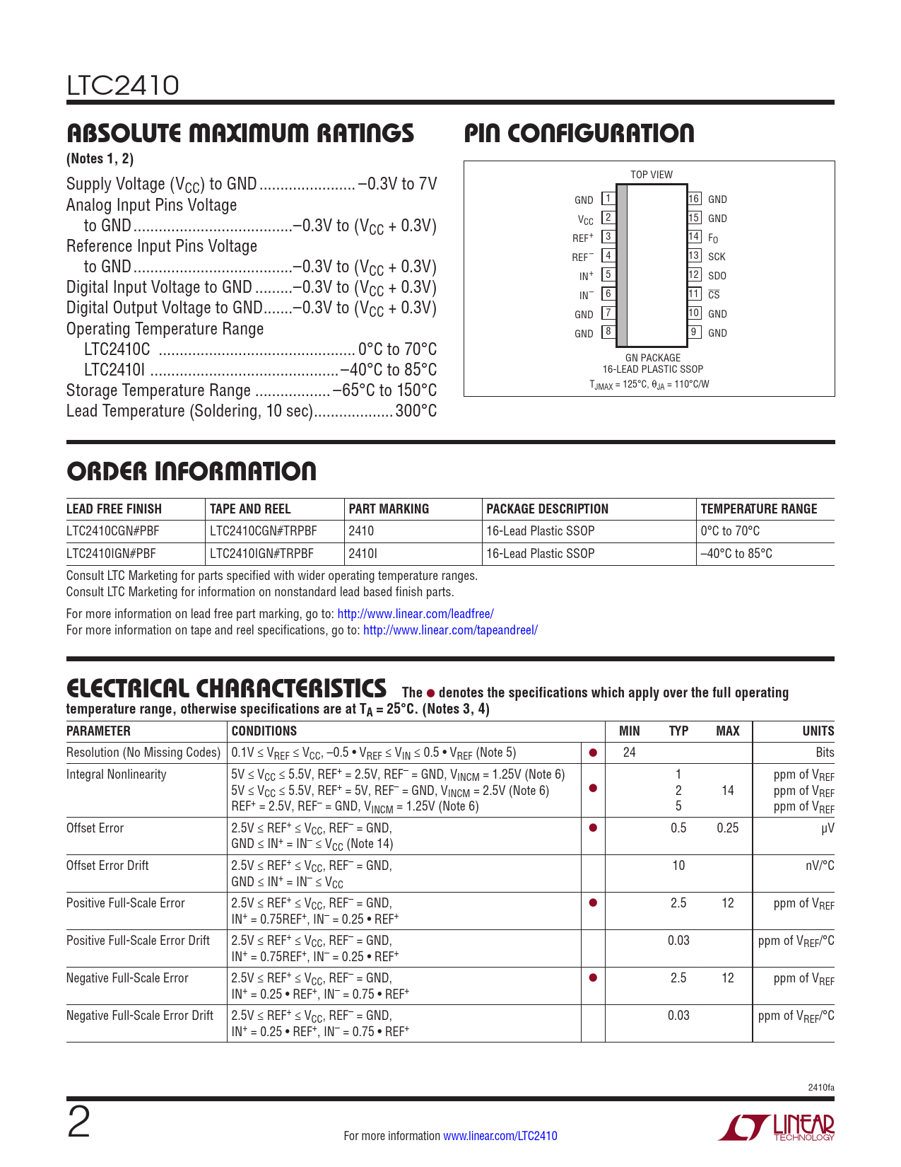 LTC2410 ABSOLUTE MAXIMUM RATINGSPIN CONFIGURATION(Notes 1, 2) Supply Voltage (V TOP VIEW CC) to GND ... –0.3V to 7V Analog Input Pins Voltage GND 1 16 GND to GND ..–0.3V to (V V 2 15 GND CC + 0.3V) CC Reference Input Pins Voltage REF+ 3 14 FO to GND ..–0.3V to (V REF– 4 13 SCK CC + 0.3V) IN+ 5 12 SDO Digital Input Voltage to GND ...–0.3V to (VCC + 0.3V) IN– 6 11 CS Digital Output Voltage to GND ...–0.3V to (VCC + 0.3V) 7 GND 10 GND Operating Temperature Range 8 GND 9 GND LTC2410C ... 0°C to 70°C GN PACKAGE LTC2410I ...–40°C to 85°C 16-LEAD PLASTIC SSOP Storage Temperature Range .. –65°C to 150°C TJMAX = 125°C, θJA = 110°C/W Lead Temperature (Soldering, 10 sec) ...300°C ORDER INFORMATION LEAD FREE FINISHTAPE AND REELPART MARKINGPACKAGE DESCRIPTIONTEMPERATURE RANGE LTC2410CGN#PBF LTC2410CGN#TRPBF 2410 16-Lead Plastic SSOP 0°C to 70°C LTC2410IGN#PBF LTC2410IGN#TRPBF 2410I 16-Lead Plastic SSOP –40°C to 85°C Consult LTC Marketing for parts specified with wider operating temperature ranges. Consult LTC Marketing for information on nonstandard lead based finish parts. For more information on lead free part marking, go to: http://www.linear.com/leadfree/ For more information on tape and reel specifications, go to: http://www.linear.com/tapeandreel/ ELECTRICAL CHARACTERISTICSThe l denotes the specifications which apply over the full operatingtemperature range, otherwise specifications are at TA = 25°C. (Notes 3, 4) PARAMETERCONDITIONSMINTYPMAXUNITS Resolution (No Missing Codes) 0.1V ≤ VREF ≤ VCC, –0.5 • VREF ≤ VIN ≤ 0.5 • VREF (Note 5) l 24 Bits Integral Nonlinearity 5V ≤ VCC ≤ 5.5V, REF+ = 2.5V, REF– = GND, VINCM = 1.25V (Note 6) 1 ppm of VREF 5V ≤ VCC ≤ 5.5V, REF+ = 5V, REF– = GND, VINCM = 2.5V (Note 6) l 2 14 ppm of VREF REF+ = 2.5V, REF– = GND, VINCM = 1.25V (Note 6) 5 ppm of VREF Offset Error 2.5V ≤ REF+ ≤ VCC, REF– = GND, l 0.5 0.25 µV GND ≤ IN+ = IN– ≤ VCC (Note 14) Offset Error Drift 2.5V ≤ REF+ ≤ VCC, REF– = GND, 10 nV/°C GND ≤ IN+ = IN– ≤ VCC Positive Full-Scale Error 2.5V ≤ REF+ ≤ VCC, REF– = GND, l 2.5 12 ppm of VREF IN+ = 0.75REF+, IN– = 0.25 • REF+ Positive Full-Scale Error Drift 2.5V ≤ REF+ ≤ VCC, REF– = GND, 0.03 ppm of VREF/°C IN+ = 0.75REF+, IN– = 0.25 • REF+ Negative Full-Scale Error 2.5V ≤ REF+ ≤ VCC, REF– = GND, l 2.5 12 ppm of VREF IN+ = 0.25 • REF+, IN– = 0.75 • REF+ Negative Full-Scale Error Drift 2.5V ≤ REF+ ≤ VCC, REF– = GND, 0.03 ppm of VREF/°C IN+ = 0.25 • REF+, IN– = 0.75 • REF+ 2410fa 2 For more information www.linear.com/LTC2410 Document Outline Features Applications Typical Application Description Absolute Maximum Ratings Order Information Electrical Characteristics Pin Configuration Electrical Characteristics Converter Characteristics Analog Input and Reference Digital Inputs and Digital Outputs Power Requirements Timing Characteristics Typical Performance Characteristics Pin Functions Functional Block Diagram Test Circuit Applications Information Typical Applications Package Description PCB Layout and Film Revision History PCB Layout and Film Related Parts