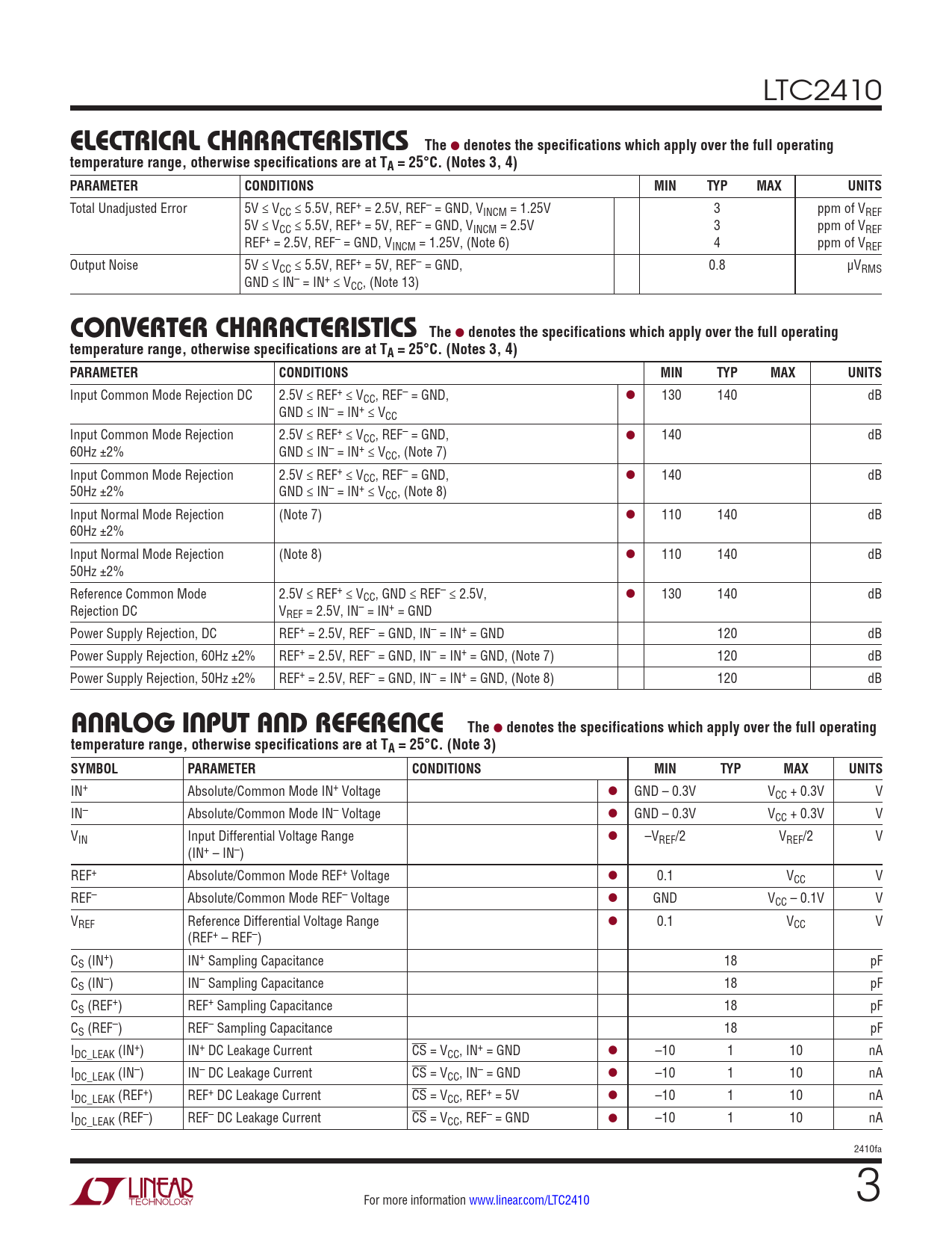 IN+ Absolute/Common Mode IN+ Voltage l GND – 0.3V VCC + 0.3V V IN– Absolute/Common Mode IN– Voltage l GND – 0.3V VCC + 0.3V V VIN Input Differential Voltage Range l –VREF/2 VREF/2 V (IN+ – IN–) REF+ Absolute/Common Mode REF+ Voltage l 0.1 VCC V REF– Absolute/Common Mode REF– Voltage l GND VCC – 0.1V V VREF Reference Differential Voltage Range l 0.1 VCC V (REF+ – REF–) CS (IN+) IN+ Sampling Capacitance 18 pF CS (IN–) IN– Sampling Capacitance 18 pF CS (REF+) REF+ Sampling Capacitance 18 pF CS (REF–) REF– Sampling Capacitance 18 pF IDC_LEAK (IN+) IN+ DC Leakage Current CS = VCC, IN+ = GND l –10 1 10 nA IDC_LEAK (IN–) IN– DC Leakage Current CS = VCC, IN– = GND l –10 1 10 nA IDC_LEAK (REF+) REF+ DC Leakage Current CS = VCC, REF+ = 5V l –10 1 10 nA IDC_LEAK (REF–) REF– DC Leakage Current CS = VCC, REF– = GND l –10 1 10 nA 2410fa For more information www.linear.com/LTC2410 3 Document Outline Features Applications Typical Application Description Absolute Maximum Ratings Order Information Electrical Characteristics Pin Configuration Electrical Characteristics Converter Characteristics Analog Input and Reference Digital Inputs and Digital Outputs Power Requirements Timing Characteristics Typical Performance Characteristics Pin Functions Functional Block Diagram Test Circuit Applications Information Typical Applications Package Description PCB Layout and Film Revision History PCB Layout and Film Related Parts