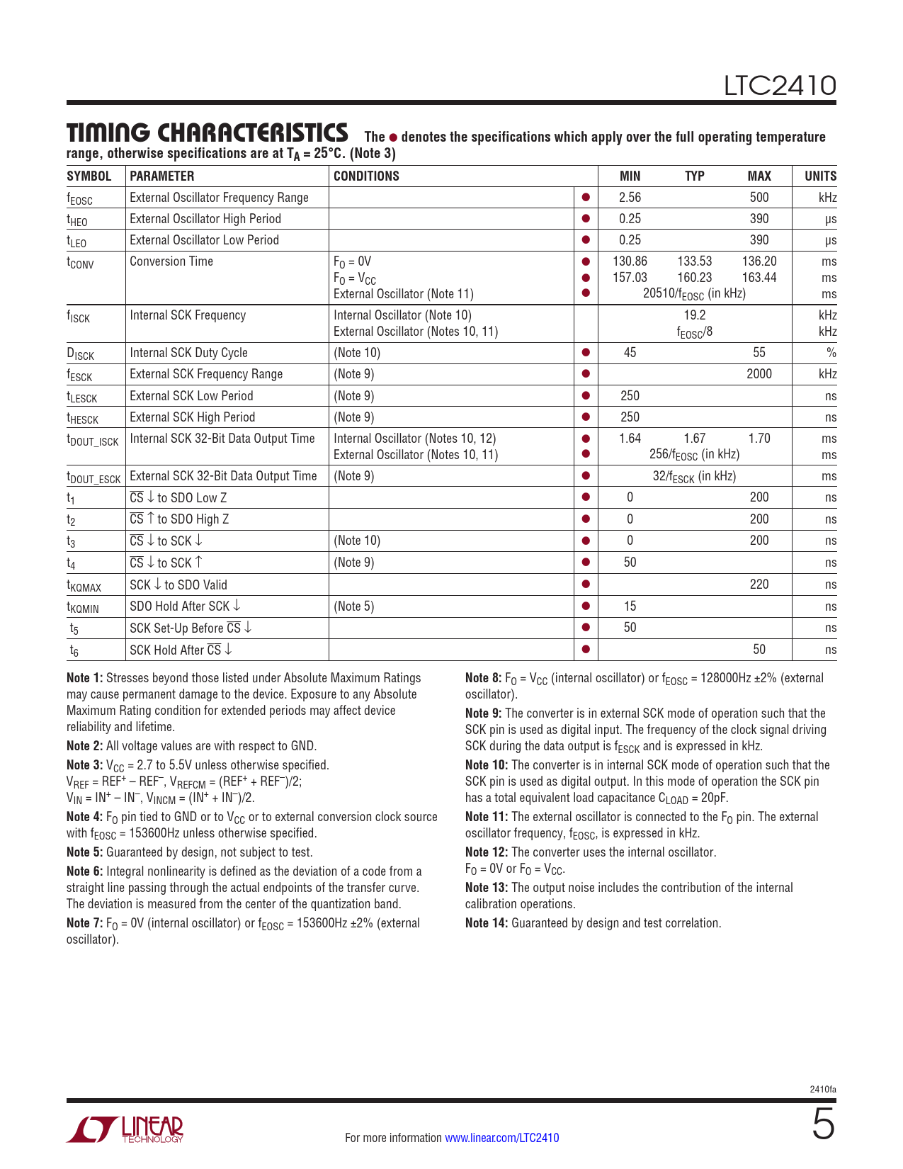 LTC2410 TIMING CHARACTERISTICSThe l denotes the specifications which apply over the full operating temperaturerange, otherwise specifications are at TA = 25°C. (Note 3)SYMBOLPARAMETERCONDITIONSMINTYPMAXUNITS fEOSC External Oscillator Frequency Range l 2.56 500 kHz tHEO External Oscillator High Period l 0.25 390 µs tLEO External Oscillator Low Period l 0.25 390 µs tCONV Conversion Time FO = 0V l 130.86 133.53 136.20 ms FO = VCC l 157.03 160.23 163.44 ms External Oscillator (Note 11) l 20510/fEOSC (in kHz) ms f ISCK Internal SCK Frequency Internal Oscillator (Note 10) 19.2 kHz External Oscillator (Notes 10, 11) fEOSC/8 kHz DISCK Internal SCK Duty Cycle (Note 10) l 45 55 % fESCK External SCK Frequency Range (Note 9) l 2000 kHz tLESCK External SCK Low Period (Note 9) l 250 ns tHESCK External SCK High Period (Note 9) l 250 ns tDOUT_ISCK Internal SCK 32-Bit Data Output Time Internal Oscillator (Notes 10, 12) l 1.64 1.67 1.70 ms External Oscillator (Notes 10, 11) l 256/fEOSC (in kHz) ms tDOUT_ESCK External SCK 32-Bit Data Output Time (Note 9) l 32/fESCK (in kHz) ms t1 CS ↓ to SDO Low Z l 0 200 ns t2 CS ↑ to SDO High Z l 0 200 ns t3 CS ↓ to SCK ↓ (Note 10) l 0 200 ns t4 CS ↓ to SCK ↑ (Note 9) l 50 ns tKQMAX SCK ↓ to SDO Valid l 220 ns tKQMIN SDO Hold After SCK ↓ (Note 5) l 15 ns t5 SCK Set-Up Before CS ↓ l 50 ns t6 SCK Hold After CS ↓ l 50 ns Note 1: Stresses beyond those listed under Absolute Maximum Ratings Note 8: FO = VCC (internal oscillator) or fEOSC = 128000Hz ±2% (external may cause permanent damage to the device. Exposure to any Absolute oscillator). Maximum Rating condition for extended periods may affect device Note 9: The converter is in external SCK mode of operation such that the reliability and lifetime. SCK pin is used as digital input. The frequency of the clock signal driving Note 2: All voltage values are with respect to GND. SCK during the data output is fESCK and is expressed in kHz. Note 3: VCC = 2.7 to 5.5V unless otherwise specified. Note 10: The converter is in internal SCK mode of operation such that the VREF = REF+ – REF–, VREFCM = (REF+ + REF–)/2; SCK pin is used as digital output. In this mode of operation the SCK pin VIN = IN+ – IN–, VINCM = (IN+ + IN–)/2. has a total equivalent load capacitance CLOAD = 20pF. Note 4: FO pin tied to GND or to VCC or to external conversion clock source Note 11: The external oscillator is connected to the FO pin. The external with fEOSC = 153600Hz unless otherwise specified. oscillator frequency, fEOSC, is expressed in kHz. Note 5: Guaranteed by design, not subject to test. Note 12: The converter uses the internal oscillator. Note 6: Integral nonlinearity is defined as the deviation of a code from a FO = 0V or FO = VCC. straight line passing through the actual endpoints of the transfer curve. Note 13: The output noise includes the contribution of the internal The deviation is measured from the center of the quantization band. calibration operations. Note 7: FO = 0V (internal oscillator) or fEOSC = 153600Hz ±2% (external Note 14: Guaranteed by design and test correlation. oscillator). 2410fa For more information www.linear.com/LTC2410 5 Document Outline Features Applications Typical Application Description Absolute Maximum Ratings Order Information Electrical Characteristics Pin Configuration Electrical Characteristics Converter Characteristics Analog Input and Reference Digital Inputs and Digital Outputs Power Requirements Timing Characteristics Typical Performance Characteristics Pin Functions Functional Block Diagram Test Circuit Applications Information Typical Applications Package Description PCB Layout and Film Revision History PCB Layout and Film Related Parts