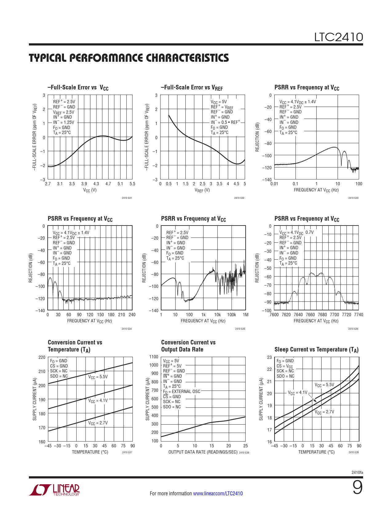 0 0 0 VCC = 4.1VDC ± 1.4V REF+ = 2.5V –10 VCC = 4.1VDC 0.7V –20 REF+ = 2.5V –20 REF– = GND REF+ = 2.5V REF– = GND IN+ = GND –20 REF– = GND –40 IN+ = GND IN– = GND IN+ = GND IN– = GND –40 F –30 O = GND IN– = GND FO = GND TA = 25°C FO = GND –60 –40 TA = 25°C –60 TA = 25°C –50 –80 –80 –60 REJECTION (dB) REJECTION (dB) REJECTION (dB) –100 –100 –70 –80 –120 –120 –90 –140 –140 –100 0 30 60 90 120 150 180 210 240 1 10 100 1k 10k 100k 1M 7600 7620 7640 7660 7680 7700 7720 7740 FREQUENCY AT VCC (Hz) FREQUENCY AT VCC (Hz) FREQUENCY AT VCC (Hz) 2410 G34 2410 G35 2410 G36
