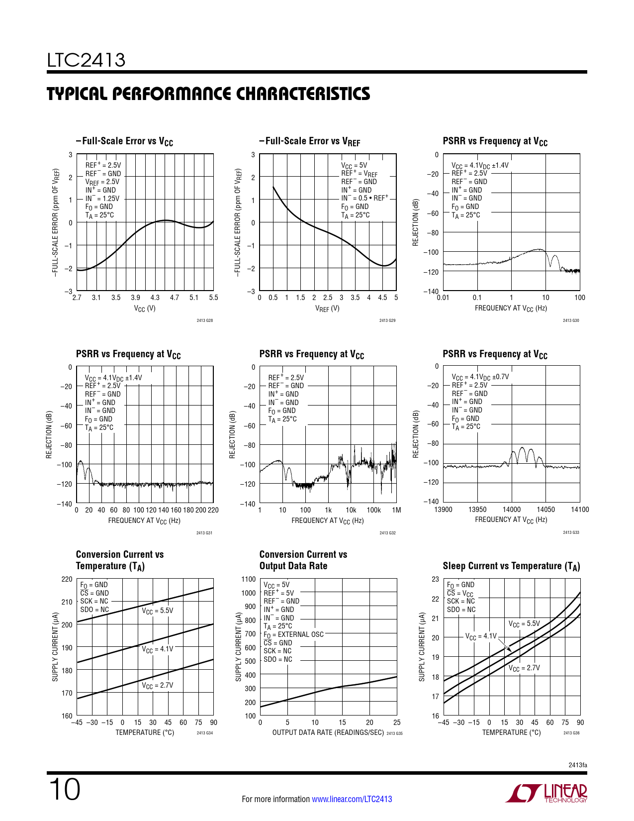 220 1100 23 FO = GND VCC = 5V FO = GND CS = GND 1000 REF+ = 5V CS = VCC 210 SCK = NC REF– = GND 22 SCK = NC SDO = NC V 900 CC = 5.5V IN+ = GND SDO = NC 800 IN– = GND 21 200 T V A = 25°C CC = 5.5V 700 FO = EXTERNAL OSC 20 VCC = 4.1V CS = GND 190 VCC = 4.1V 600 SCK = NC 500 SDO = NC 19 180 VCC = 2.7V SUPPLY CURRENT (µA) SUPPLY CURRENT (µA) 400 SUPPLY CURRENT (µA) 18 VCC = 2.7V 300 170 17 200 160 100 16 –45 –30 –15 0 15 30 45 60 75 90 0 5 10 15 20 25 –45 –30 –15 0 15 30 45 60 75 90 TEMPERATURE (°C) 2413 G34 OUTPUT DATA RATE (READINGS/SEC) 2413 G35 TEMPERATURE (°C) 2413 G36 2413fa 10 For more information www.linear.com/LTC2413