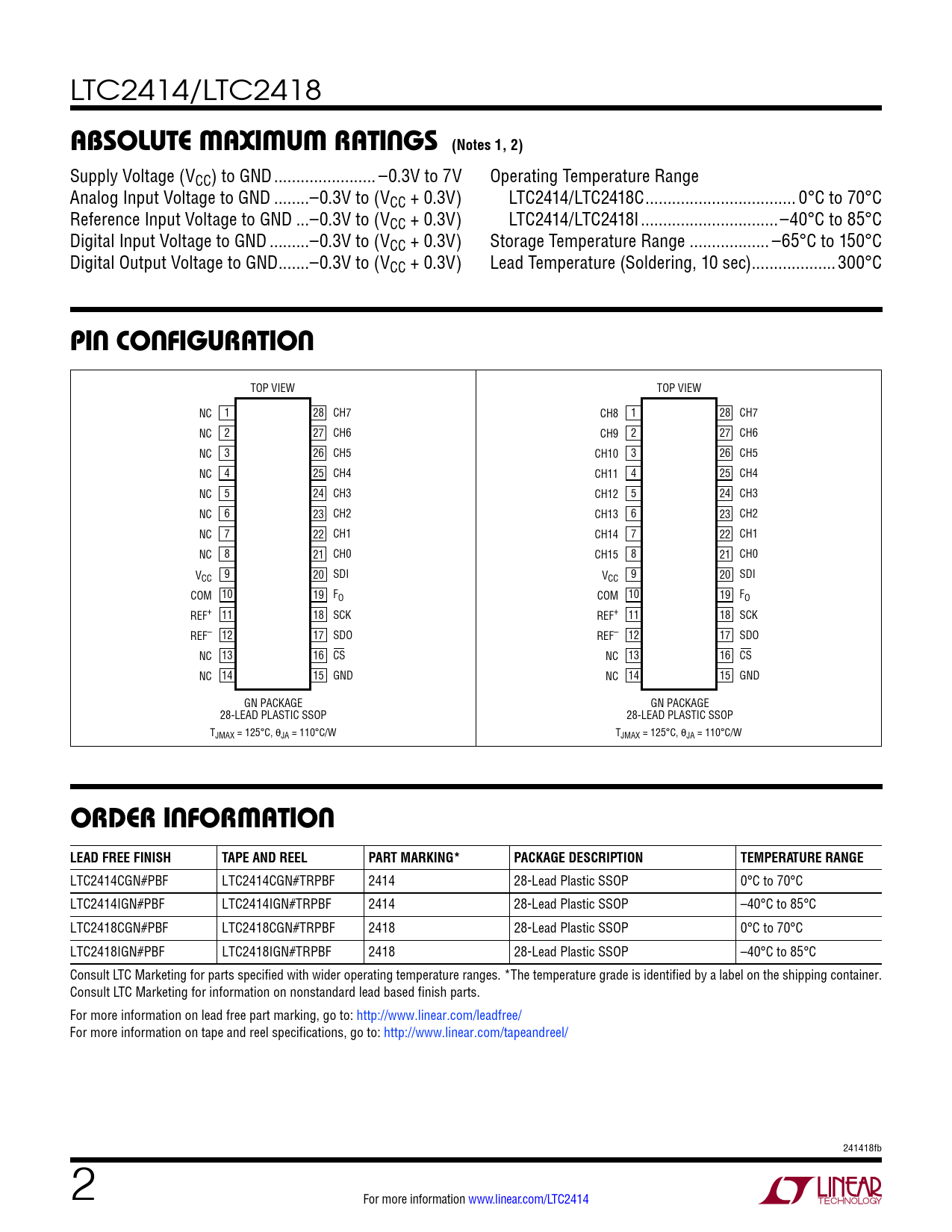 LTC2414CGN#PBF LTC2414CGN#TRPBF 2414 28-Lead Plastic SSOP 0°C to 70°C LTC2414IGN#PBF LTC2414IGN#TRPBF 2414 28-Lead Plastic SSOP –40°C to 85°C LTC2418CGN#PBF LTC2418CGN#TRPBF 2418 28-Lead Plastic SSOP 0°C to 70°C LTC2418IGN#PBF LTC2418IGN#TRPBF 2418 28-Lead Plastic SSOP –40°C to 85°C Consult LTC Marketing for parts specified with wider operating temperature ranges. *The temperature grade is identified by a label on the shipping container. Consult LTC Marketing for information on nonstandard lead based finish parts. For more information on lead free part marking, go to: http://www.linear.com/leadfree/ For more information on tape and reel specifications, go to: http://www.linear.com/tapeandreel/ 241418fb 2 For more information www.linear.com/LTC2414