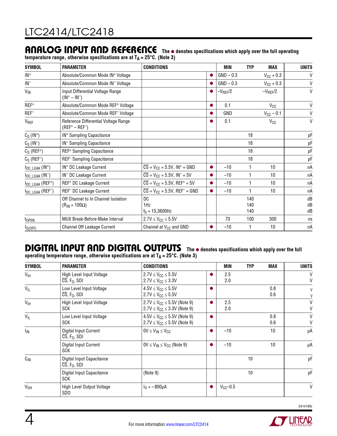 LTC2414/LTC2418 analog inpuT anD reFerence The l denotes specifications which apply over the full operatingtemperature range, otherwise specifications are at TA = 25°C. (Note 3) SYMBOLPARAMETERCONDITIONSMINTYPMAXUNITS IN+ Absolute/Common Mode IN+ Voltage l GND – 0.3 VCC + 0.3 V IN– Absolute/Common Mode IN– Voltage l GND – 0.3 VCC + 0.3 V VIN Input Differential Voltage Range l –VREF/2 –VREF/2 V (IN+ – IN–) REF+ Absolute/Common Mode REF+ Voltage l 0.1 VCC V REF– Absolute/Common Mode REF– Voltage l GND VCC – 0.1 V VREF Reference Differential Voltage Range l 0.1 VCC V (REF+ – REF–) CS (IN+) IN+ Sampling Capacitance 18 pF CS (IN–) IN– Sampling Capacitance 18 pF CS (REF+) REF+ Sampling Capacitance 18 pF CS (REF–) REF– Sampling Capacitance 18 pF IDC_LEAK (IN+) IN+ DC Leakage Current CS = VCC = 5.5V, IN+ = GND l –10 1 10 nA IDC_LEAK (IN–) IN– DC Leakage Current CS = VCC = 5.5V, IN– = 5V l –10 1 10 nA IDC_LEAK (REF+) REF+ DC Leakage Current CS = VCC = 5.5V, REF+ = 5V l –10 1 10 nA IDC_LEAK (REF–) REF– DC Leakage Current CS = VCC = 5.5V, REF– = GND l –10 1 10 nA Off Channel to In Channel Isolation DC 140 dB (RIN = 100Ω) 1Hz 140 dB fS = 15,3600Hz 140 dB tOPEN MUX Break-Before-Make Interval 2.7V ≤ VCC ≤ 5.5V 70 100 300 ns IS(OFF) Channel Off Leakage Current Channel at VCC and GND l –10 1 10 nA DigiTal inpuT anD DigiTal ouTpuTs The l denotes specifications which apply over the fulloperating temperature range, otherwise specifications are at TA = 25°C. (Note 3) SYMBOLPARAMETERCONDITIONSMINTYPMAXUNITS VIH High Level Input Voltage 2.7V ≤ VCC ≤ 5.5V l 2.5 V CS, FO, SDI 2.7V ≤ VCC ≤ 3.3V 2.0 V VIL Low Level Input Voltage 4.5V ≤ VCC ≤ 5.5V l 0.8 V CS, FO, SDI 2.7V ≤ VCC ≤ 5.5V 0.6 V VIH High Level Input Voltage 2.7V ≤ VCC ≤ 5.5V (Note 9) l 2.5 V SCK 2.7V ≤ VCC ≤ 3.3V (Note 9) 2.0 V VIL Low Level Input Voltage 4.5V ≤ VCC ≤ 5.5V (Note 9) l 0.8 V SCK 2.7V ≤ VCC ≤ 5.5V (Note 9) 0.6 V IIN Digital Input Current 0V ≤ VIN ≤ VCC l –10 10 µA CS, FO, SDI Digital Input Current 0V ≤ VIN ≤ VCC (Note 9) l –10 10 µA SCK CIN Digital Input Capacitance 10 pF CS, FO, SDI Digital Input Capacitance (Note 9) 10 pF SCK VOH High Level Output Voltage IO = –800µA l VCC–0.5 V SDO 241418fb 4 For more information www.linear.com/LTC2414