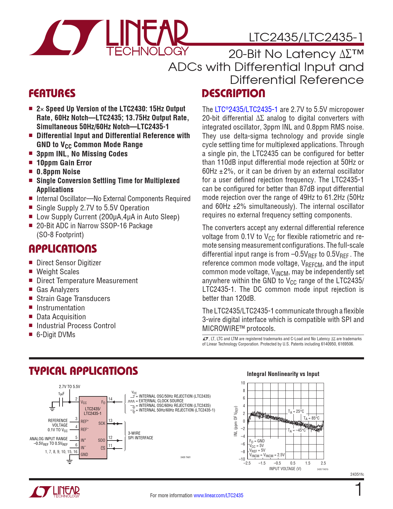 LTC2435/LTC2435-1 20-Bit No Latency ∆∑™ ADCs with Differential Input and Differential Reference FeaTuresDescripTion n 2 × Speed Up Version of the LTC2430: 15Hz Output The LTC®2435/LTC2435-1 are 2.7V to 5.5V micropower Rate, 60Hz Notch—LTC2435; 13.75Hz Output Rate, 20-bit differential ∆∑ analog to digital converters with Simultaneous 50Hz/60Hz Notch—LTC2435-1 integrated oscillator, 3ppm INL and 0.8ppm RMS noise. n Differential Input and Differential Reference with They use delta-sigma technology and provide single GND to VCC Common Mode Range cycle settling time for multiplexed applications. Through n 3ppm INL, No Missing Codes a single pin, the LTC2435 can be configured for better n 10ppm Gain Error than 110dB input differential mode rejection at 50Hz or n 0.8ppm Noise 60Hz ±2%, or it can be driven by an external oscillator n Single Conversion Settling Time for Multiplexed for a user defined rejection frequency. The LTC2435-1 Applications can be configured for better than 87dB input differential n Internal Oscillator—No External Components Required mode rejection over the range of 49Hz to 61.2Hz (50Hz n and 60Hz ±2% simultaneously). The internal oscillator Single Supply 2.7V to 5.5V Operation n Low Supply Current (200µA,4µA in Auto Sleep) requires no external frequency setting components. n 20-Bit ADC in Narrow SSOP-16 Package The converters accept any external differential reference (SO-8 Footprint) voltage from 0.1V to VCC for flexible ratiometric and re- applicaTions mote sensing measurement configurations. The full-scale differential input range is from –0.5VREF to 0.5VREF . The n Direct Sensor Digitizer reference common mode voltage, VREFCM, and the input n Weight Scales common mode voltage, VINCM, may be independently set n Direct Temperature Measurement anywhere within the GND to VCC range of the LTC2435/ n Gas Analyzers LTC2435-1. The DC common mode input rejection is n Strain Gage Transducers better than 120dB. n Instrumentation The LTC2435/LTC2435-1 communicate through a flexible n Data Acquisition 3-wire digital interface which is compatible with SPI and n Industrial Process Control MICROWIRE™ protocols. n 6-Digit DVMs L, LT, LTC and LTM are registered trademarks and C-Load and No Latency ∆∑ are trademarks of Linear Technology Corporation. Protected by U.S. Patents including 6140950, 6169506. Typical applicaTionsIntegral Nonlinearity vs Input 10 2.7V TO 5.5V 8 1μF VCC= INTERNAL OSC/50Hz REJECTION (LTC2435) 2 14 6 V = EXTERNAL CLOCK SOURCE CC FO = INTERNAL OSC/60Hz REJECTION (LTC2435) 4 LTC2435/ = INTERNAL 50Hz/60Hz REJECTION (LTC2435-1) LTC2435-1 REF 2 TA = 25°C 3 T REFERENCE A = 85°C REF+ 13 SCK 0 VOLTAGE 4 0.1V TO V REF– –2 CC T 3-WIRE A = –45°C 5 12 INL (ppm OF V –4 ANALOG INPUT RANGE IN+ SDO SPI INTERFACE F –0.5V O = GND REF TO 0.5VREF 6 –6 IN– 11 V CS CC = 5V 1, 7, 8, 9, 10, 15, 16 –8 VREF = 5V GND V 2435 TA01 INCM = VINCM = 2.5V –10–2.5 –1.5 –0.5 0.5 1.5 2.5 INPUT VOLTAGE (V) 2435 TA01b 24351fc For more information www.linear.com/LTC2435 1 Document Outline Features Description Applications Typical Applications Absolute Maximum Ratings Pin Configuration Order Information Electrical Characteristics Converter Characteristics Analog Input And Reference Digital Inputs And Digital Outputs Power Requirements Timing Characteristics Typical Performance Characteristics Pin Functions Functional Block Diagram Test Circuits Applications Information Package Description Revision History Typical Application Related Parts
