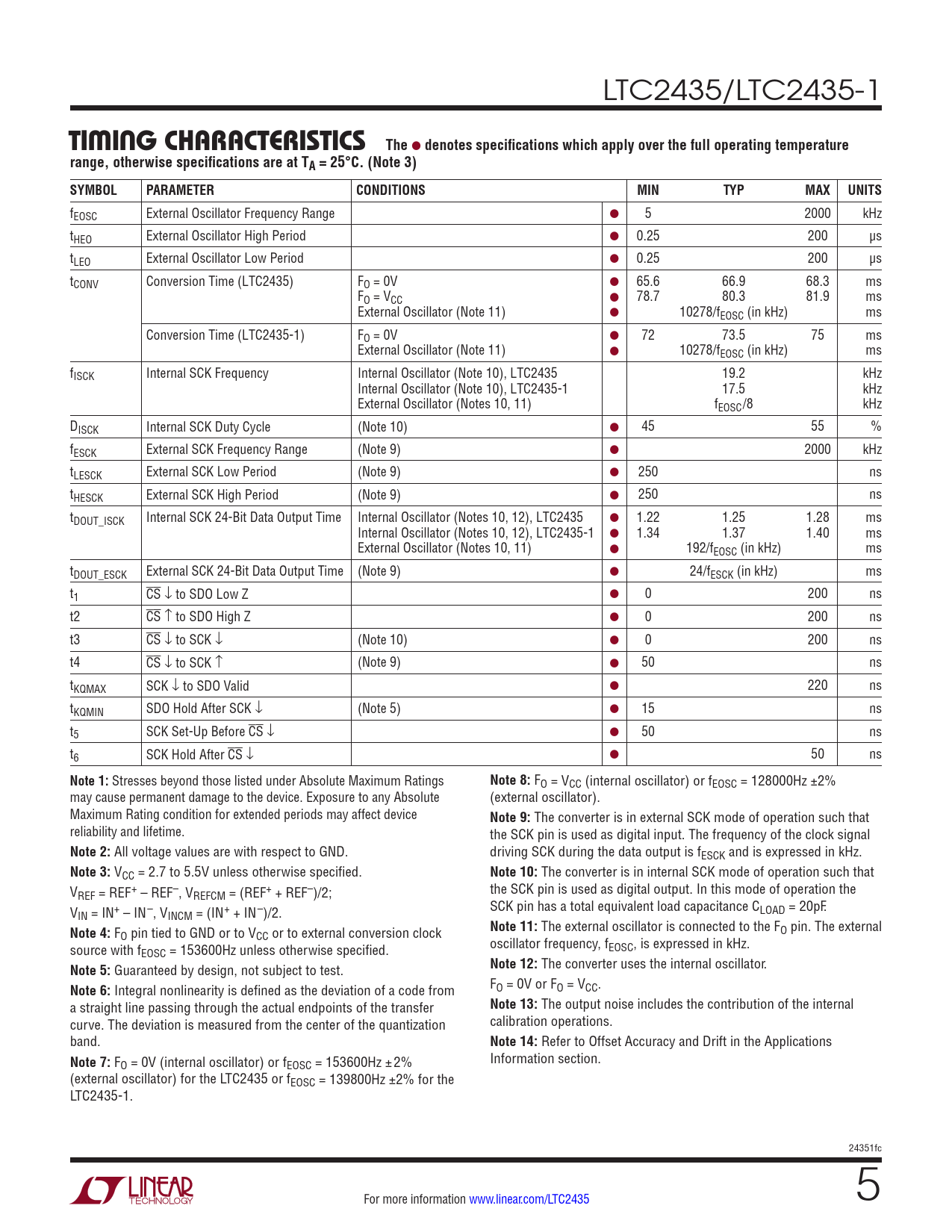 fEOSC External Oscillator Frequency Range ● 5 2000 kHz tHEO External Oscillator High Period ● 0.25 200 µs tLEO External Oscillator Low Period ● 0.25 200 µs tCONV Conversion Time (LTC2435) FO = 0V ● 65.6 66.9 68.3 ms FO = VCC ● 78.7 80.3 81.9 ms External Oscillator (Note 11) ● 10278/fEOSC (in kHz) ms Conversion Time (LTC2435-1) FO = 0V ● 72 73.5 75 ms External Oscillator (Note 11) ● 10278/fEOSC (in kHz) ms f ISCK Internal SCK Frequency Internal Oscillator (Note 10), LTC2435 19.2 kHz Internal Oscillator (Note 10), LTC2435-1 17.5 kHz External Oscillator (Notes 10, 11) fEOSC/8 kHz DISCK Internal SCK Duty Cycle (Note 10) ● 45 55 % fESCK External SCK Frequency Range (Note 9) ● 2000 kHz tLESCK External SCK Low Period (Note 9) ● 250 ns tHESCK External SCK High Period (Note 9) ● 250 ns tDOUT_ISCK Internal SCK 24-Bit Data Output Time Internal Oscillator (Notes 10, 12), LTC2435 ● 1.22 1.25 1.28 ms Internal Oscillator (Notes 10, 12), LTC2435-1 ● 1.34 1.37 1.40 ms External Oscillator (Notes 10, 11) ● 192/fEOSC (in kHz) ms tDOUT_ESCK External SCK 24-Bit Data Output Time (Note 9) ● 24/fESCK (in kHz) ms t1 CS ↓ to SDO Low Z ● 0 200 ns t2 CS ↑ to SDO High Z ● 0 200 ns t3 CS ↓ to SCK ↓ (Note 10) ● 0 200 ns t4 CS ↓ to SCK ↑ (Note 9) ● 50 ns tKQMAX SCK ↓ to SDO Valid ● 220 ns tKQMIN SDO Hold After SCK ↓ (Note 5) ● 15 ns t5 SCK Set-Up Before CS ↓ ● 50 ns t6 SCK Hold After CS ↓ ● 50 ns