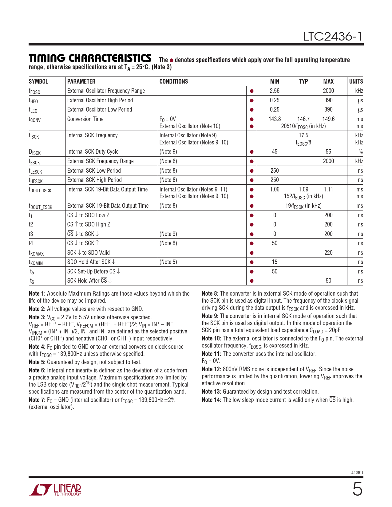 fEOSC External Oscillator Frequency Range ● 2.56 2000 kHz tHEO External Oscillator High Period ● 0.25 390 µs tLEO External Oscillator Low Period ● 0.25 390 µs tCONV Conversion Time FO = 0V ● 143.8 146.7 149.6 ms External Oscillator (Note 10) ● 20510/fEOSC (in kHz) ms fISCK Internal SCK Frequency Internal Oscillator (Note 9) 17.5 kHz External Oscillator (Notes 9, 10) fEOSC/8 kHz DISCK Internal SCK Duty Cycle (Note 9) ● 45 55 % fESCK External SCK Frequency Range (Note 8) ● 2000 kHz tLESCK External SCK Low Period (Note 8) ● 250 ns tHESCK External SCK High Period (Note 8) ● 250 ns tDOUT_ISCK Internal SCK 19-Bit Data Output Time Internal Oscillator (Notes 9, 11) ● 1.06 1.09 1.11 ms External Oscillator (Notes 9, 10) ● 152/fEOSC (in kHz) ms tDOUT_ESCK External SCK 19-Bit Data Output Time (Note 8) ● 19/fESCK (in kHz) ms t1 CS ↓ to SDO Low Z ● 0 200 ns t2 CS ↑ to SDO High Z ● 0 200 ns t3 CS ↓ to SCK ↓ (Note 9) ● 0 200 ns t4 CS ↓ to SCK ↑ (Note 8) ● 50 ns tKQMAX SCK ↓ to SDO Valid ● 220 ns tKQMIN SDO Hold After SCK ↓ (Note 5) ● 15 ns t5 SCK Set-Up Before CS ↓ ● 50 ns t6 SCK Hold After CS ↓ ● 50 ns