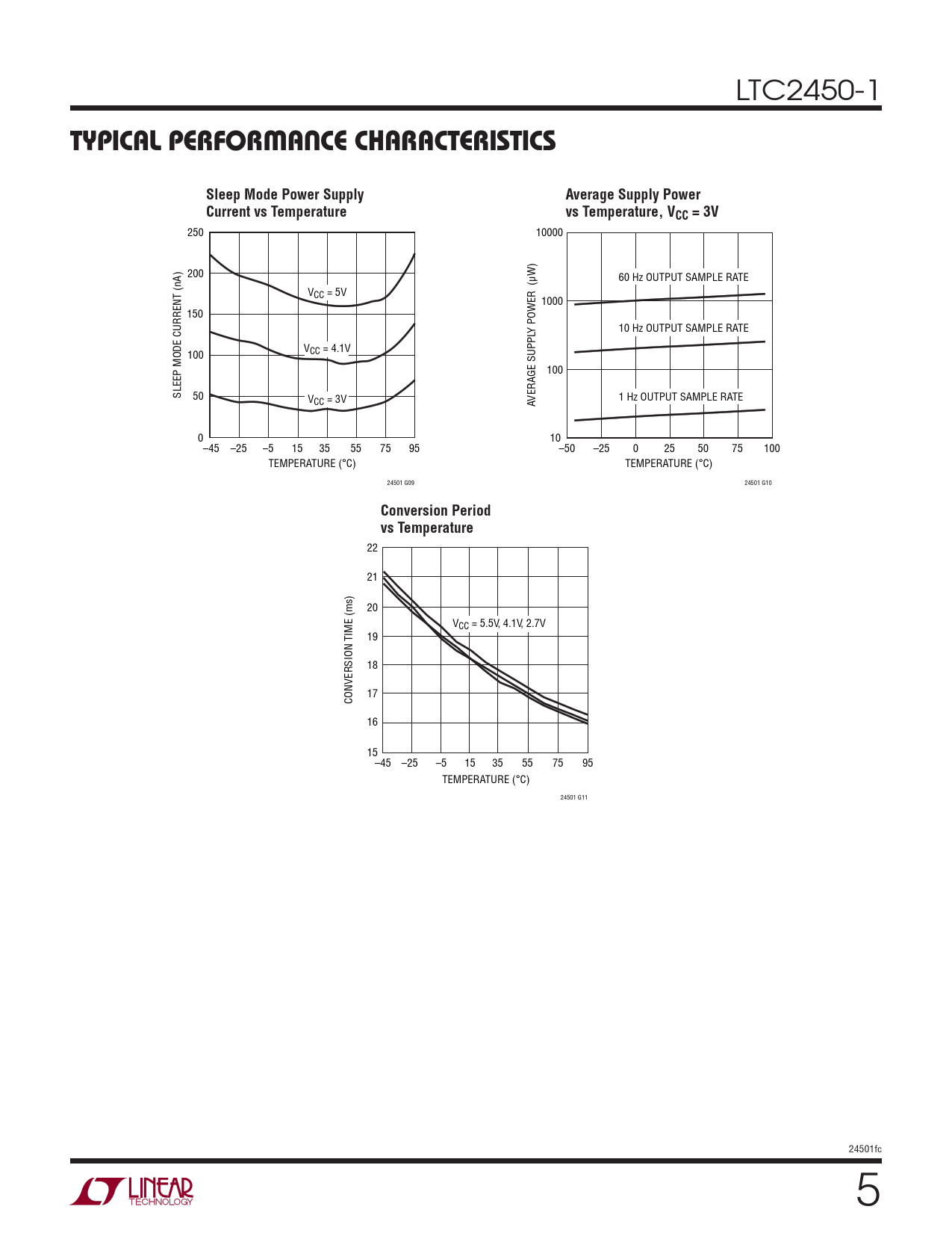 22 21 20 VCC = 5.5V, 4.1V, 2.7V 19 18 17 CONVERSION TIME (ms) 16 15 –45 –25 –5 15 35 55 75 95 TEMPERATURE (°C) 24501 G11 24501fc 5