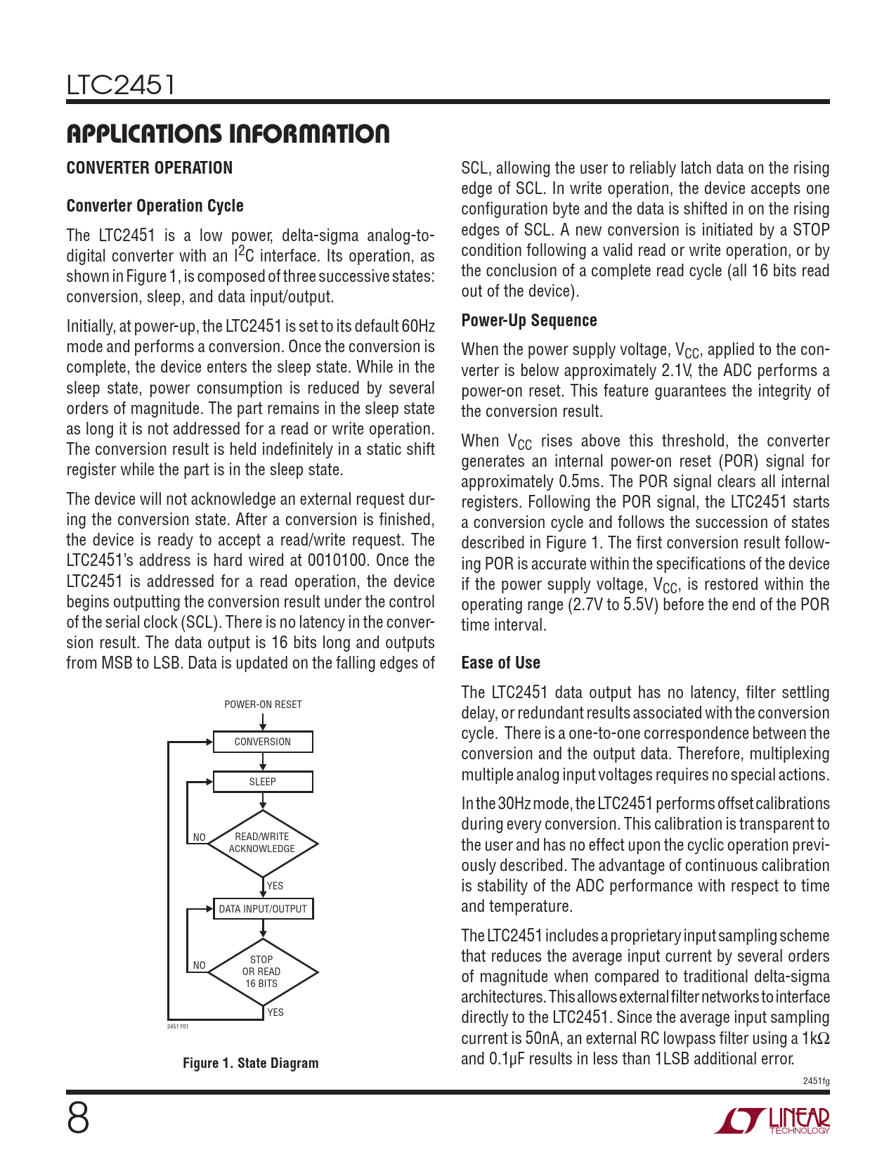 LTC2451 APPLICATIONS INFORMATION CONVERTER OPERATION SCL, allowing the user to reliably latch data on the rising edge of SCL. In write operation, the device accepts one Converter Operation Cycle configuration byte and the data is shifted in on the rising The LTC2451 is a low power, delta-sigma analog-to- edges of SCL. A new conversion is initiated by a STOP digital converter with an I2C interface. Its operation, as condition following a valid read or write operation, or by shown in Figure 1, is composed of three successive states: the conclusion of a complete read cycle (all 16 bits read conversion, sleep, and data input/output. out of the device). Initially, at power-up, the LTC2451 is set to its default 60Hz Power-Up Sequence mode and performs a conversion. Once the conversion is When the power supply voltage, VCC, applied to the con- complete, the device enters the sleep state. While in the verter is below approximately 2.1V, the ADC performs a sleep state, power consumption is reduced by several power-on reset. This feature guarantees the integrity of orders of magnitude. The part remains in the sleep state the conversion result. as long it is not addressed for a read or write operation. The conversion result is held indefinitely in a static shift When VCC rises above this threshold, the converter register while the part is in the sleep state. generates an internal power-on reset (POR) signal for approximately 0.5ms. The POR signal clears all internal The device will not acknowledge an external request dur- registers. Following the POR signal, the LTC2451 starts ing the conversion state. After a conversion is finished, a conversion cycle and follows the succession of states the device is ready to accept a read/write request. The described in Figure 1. The first conversion result follow- LTC2451’s address is hard wired at 0010100. Once the ing POR is accurate within the specifications of the device LTC2451 is addressed for a read operation, the device if the power supply voltage, VCC, is restored within the begins outputting the conversion result under the control operating range (2.7V to 5.5V) before the end of the POR of the serial clock (SCL). There is no latency in the conver- time interval. sion result. The data output is 16 bits long and outputs from MSB to LSB. Data is updated on the falling edges of Ease of Use The LTC2451 data output has no latency, filter settling POWER-ON RESET delay, or redundant results associated with the conversion cycle. There is a one-to-one correspondence between the CONVERSION conversion and the output data. Therefore, multiplexing multiple analog input voltages requires no special actions. SLEEP In the 30Hz mode, the LTC2451 performs offset calibrations during every conversion. This calibration is transparent to NO READ/WRITE ACKNOWLEDGE the user and has no effect upon the cyclic operation previ- ously described. The advantage of continuous calibration YES is stability of the ADC performance with respect to time DATA INPUT/OUTPUT and temperature. The LTC2451 includes a proprietary input sampling scheme STOP that reduces the average input current by several orders NO OR READ of magnitude when compared to traditional delta-sigma 16 BITS architectures. This allows external filter networks to interface YES directly to the LTC2451. Since the average input sampling 2451 F01 current is 50nA, an external RC lowpass filter using a 1kΩ Figure 1. State Diagram and 0.1µF results in less than 1LSB additional error. 2451fg 8 Document Outline Features Applications Description Typical Application Absolute Maximum Ratings Pin Configuration Order Information Electrical Characteristics Analog Input And References Power Requirements I2C Inputs And Outputs I2C Timing Characteristics Typical Performance Characteristics Pin Functions Block Diagram Applications Information Typical Applications Package Description Revision History Typical Application Related Parts