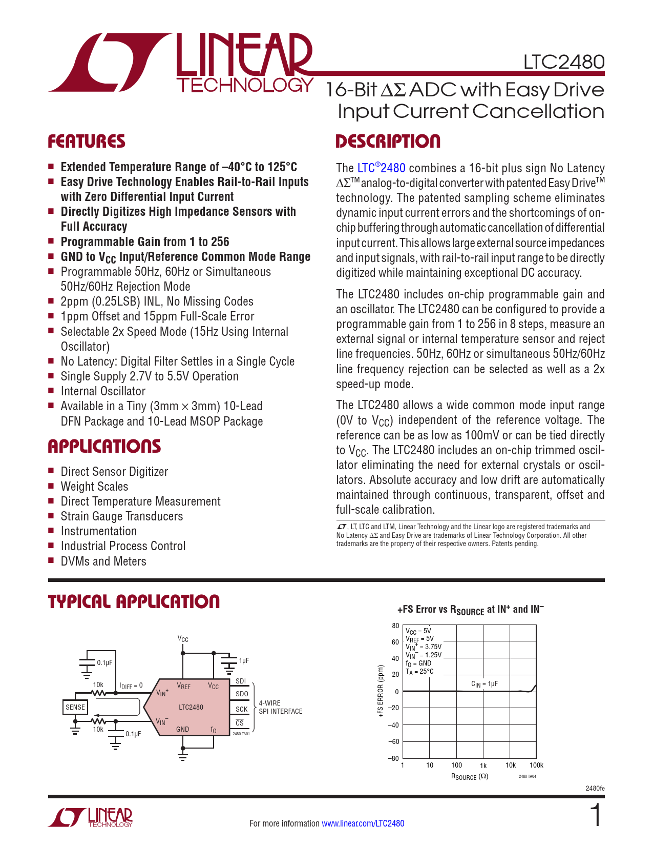 LTC2480 16-Bit ∆Σ ADC with Easy Drive Input Current Cancellation FEATURESDESCRIPTION n Extended Temperature Range of –40°C to 125°C The LTC®2480 combines a 16-bit plus sign No Latency n Easy Drive Technology Enables Rail-to-Rail Inputs ∆Σ™ analog-to-digital converter with patented Easy Drive™ with Zero Differential Input Current technology. The patented sampling scheme eliminates n Directly Digitizes High Impedance Sensors with dynamic input current errors and the shortcomings of on- Full Accuracy chip buffering through automatic cancellation of differential n Programmable Gain from 1 to 256 input current. This al ows large external source impedances n GND to VCC Input/Reference Common Mode Range and input signals, with rail-to-rail input range to be directly n Programmable 50Hz, 60Hz or Simultaneous digitized while maintaining exceptional DC accuracy. 50Hz/60Hz Rejection Mode The LTC2480 includes on-chip programmable gain and n 2ppm (0.25LSB) INL, No Missing Codes an oscillator. The LTC2480 can be configured to provide a n 1ppm Offset and 15ppm Full-Scale Error programmable gain from 1 to 256 in 8 steps, measure an n Selectable 2x Speed Mode (15Hz Using Internal external signal or internal temperature sensor and reject Oscillator) line frequencies. 50Hz, 60Hz or simultaneous 50Hz/60Hz n No Latency: Digital Filter Settles in a Single Cycle line frequency rejection can be selected as well as a 2x n Single Supply 2.7V to 5.5V Operation speed-up mode. n Internal Oscillator n Available in a Tiny (3mm × 3mm) 10-Lead The LTC2480 allows a wide common mode input range DFN Package and 10-Lead MSOP Package (0V to VCC) independent of the reference voltage. The APPLICATIONS reference can be as low as 100mV or can be tied directly to VCC. The LTC2480 includes an on-chip trimmed oscil- lator eliminating the need for external crystals or oscil- n Direct Sensor Digitizer lators. Absolute accuracy and low drift are automatically n Weight Scales maintained through continuous, transparent, offset and n Direct Temperature Measurement full-scale calibration. n Strain Gauge Transducers L, LT, LTC and LTM, Linear Technology and the Linear logo are registered trademarks and n Instrumentation No Latency ∆Σ and Easy Drive are trademarks of Linear Technology Corporation. All other n Industrial Process Control trademarks are the property of their respective owners. Patents pending. n DVMs and Meters TYPICAL APPLICATION+FS Error vs RSOURCE at IN+ and IN– 80 VCC = 5V VCC 60 VREF = 5V V + IN = 3.75V – 40 VIN = 1.25V 1µF 0.1µF fO = GND 20 TA = 25°C 10k SDI IDIFF = 0 V C REF VCC IN = 1µF V + 0 IN SDO SENSE LTC2480 4-WIRE SCK –20 SPI INTERFACE +FS ERROR (ppm) V – IN CS –40 10k GND fO 2480 TA01 0.1µF –60 –80 1 10 100 1k 10k 100k RSOURCE (Ω) 2480 TA04 2480fe For more information www.linear.com/LTC2480 1 Document Outline Features Applications Description Typical Application Absolute Maximum Ratings Pin Configuration Order Information Electrical Characteristics (Normal Speed) Electrical Characteristics (2X Speed) Converter Characteristics Analog Input and Reference Analog Inputs and Digital Outputs Power Requirements Timing Characteristics Typical Performance Characteristics Pin Functions Functional Block Diagram Test Circuits Timing Diagrams Applications Information Package Description Revision History Typical Application Related Parts