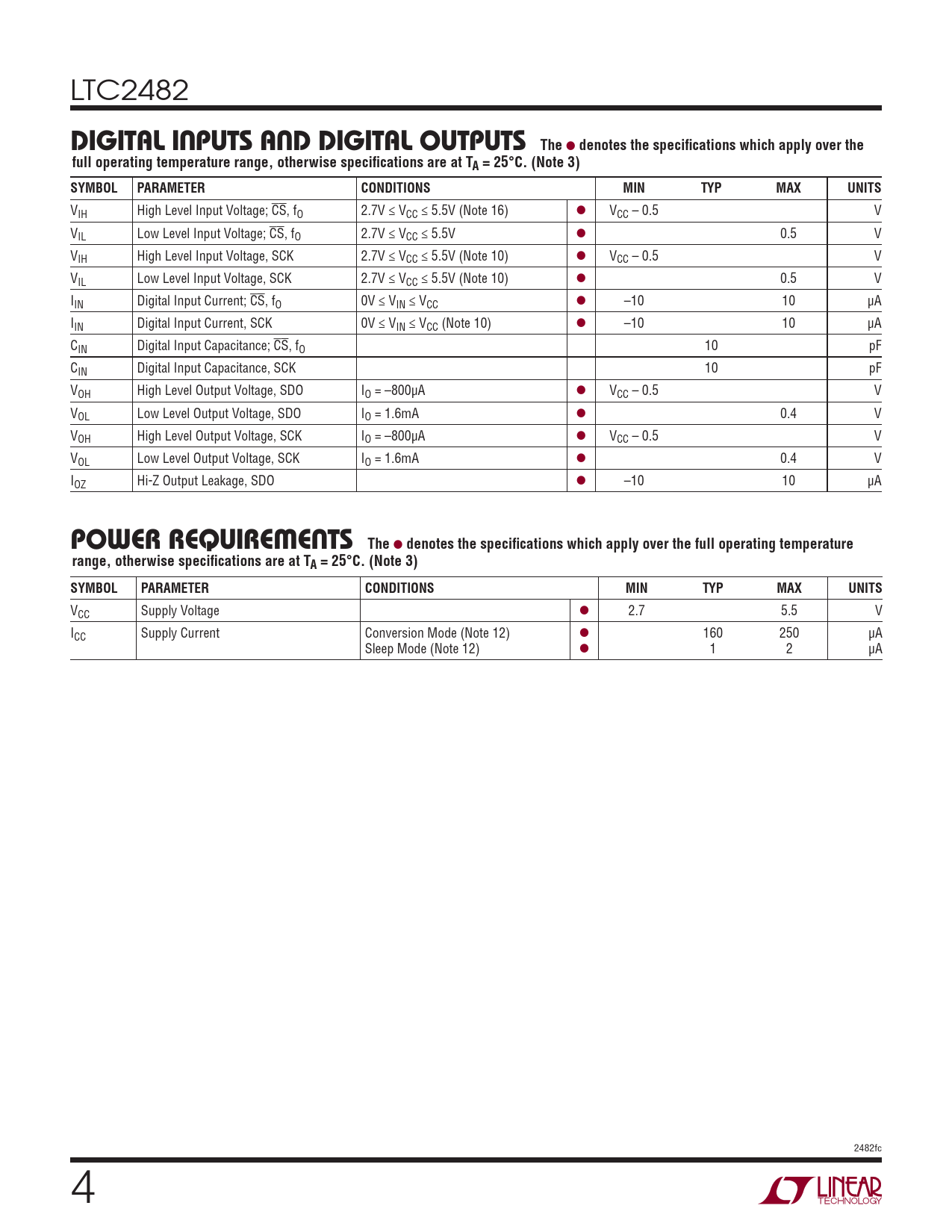 VCC Supply Voltage l 2.7 5.5 V ICC Supply Current Conversion Mode (Note 12) l 160 250 μA Sleep Mode (Note 12) l 1 2 μA 2482fc 4