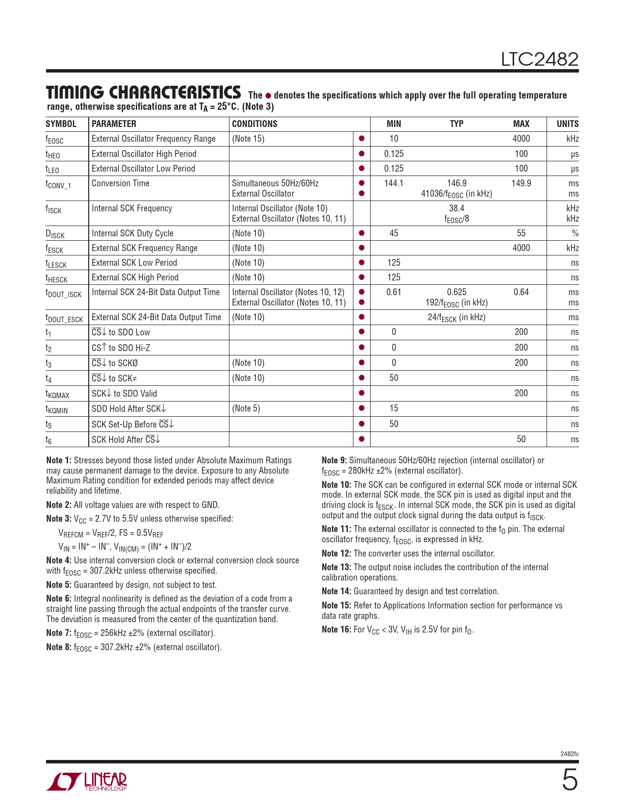 LTC2482 TIMING CHARACTERISTICSThe l denotes the specifi cations which apply over the full operating temperaturerange, otherwise specifi cations are at TA = 25°C. (Note 3)SYMBOLPARAMETERCONDITIONSMINTYPMAXUNITS fEOSC External Oscillator Frequency Range (Note 15) l 10 4000 kHz tHEO External Oscillator High Period l 0.125 100 μs tLEO External Oscillator Low Period l 0.125 100 μs tCONV_1 Conversion Time Simultaneous 50Hz/60Hz l 144.1 146.9 149.9 ms External Oscillator l 41036/fEOSC (in kHz) ms fISCK Internal SCK Frequency Internal Oscillator (Note 10) 38.4 kHz External Oscillator (Notes 10, 11) fEOSC/8 kHz DISCK Internal SCK Duty Cycle (Note 10) l 45 55 % fESCK External SCK Frequency Range (Note 10) l 4000 kHz tLESCK External SCK Low Period (Note 10) l 125 ns tHESCK External SCK High Period (Note 10) l 125 ns tDOUT_ISCK Internal SCK 24-Bit Data Output Time Internal Oscillator (Notes 10, 12) l 0.61 0.625 0.64 ms External Oscillator (Notes 10, 11) l 192/fEOSC (in kHz) ms tDOUT_ESCK External SCK 24-Bit Data Output Time (Note 10) l 24/fESCK (in kHz) ms t1 CS↓ to SDO Low l 0 200 ns t2 CS↑ to SDO Hi-Z l 0 200 ns t3 CS↓ to SCKØ (Note 10) l 0 200 ns t4 CS↓ to SCK≠ (Note 10) l 50 ns tKQMAX SCK↓ to SDO Valid l 200 ns tKQMIN SDO Hold After SCK↓ (Note 5) l 15 ns t5 SCK Set-Up Before CS↓ l 50 ns t6 SCK Hold After CS↓ l 50 ns Note 1: Stresses beyond those listed under Absolute Maximum Ratings Note 9: Simultaneous 50Hz/60Hz rejection (internal oscillator) or may cause permanent damage to the device. Exposure to any Absolute fEOSC = 280kHz ±2% (external oscillator). Maximum Rating condition for extended periods may affect device Note 10: The SCK can be confi gured in external SCK mode or internal SCK reliability and lifetime. mode. In external SCK mode, the SCK pin is used as digital input and the Note 2: All voltage values are with respect to GND. driving clock is fESCK. In internal SCK mode, the SCK pin is used as digital Note 3: V output and the output clock signal during the data output is f CC = 2.7V to 5.5V unless otherwise specifi ed: ISCK. V Note 11: The external oscillator is connected to the f REFCM = VREF/2, FS = 0.5VREF O pin. The external oscillator frequency, fEOSC, is expressed in kHz. VIN = IN+ – IN–, VIN(CM) = (IN+ + IN–)/2 Note 12: The converter uses the internal oscillator. Note 4: Use internal conversion clock or external conversion clock source with f Note 13: The output noise includes the contribution of the internal EOSC = 307.2kHz unless otherwise specifi ed. calibration operations. Note 5: Guaranteed by design, not subject to test. Note 14: Guaranteed by design and test correlation. Note 6: Integral nonlinearity is defi ned as the deviation of a code from a straight line passing through the actual endpoints of the transfer curve. Note 15: Refer to Applications Information section for performance vs The deviation is measured from the center of the quantization band. data rate graphs. Note 7: f Note 16: For V EOSC = 256kHz ±2% (external oscillator). CC < 3V, VIH is 2.5V for pin fO. Note 8: fEOSC = 307.2kHz ±2% (external oscillator). 2482fc 5