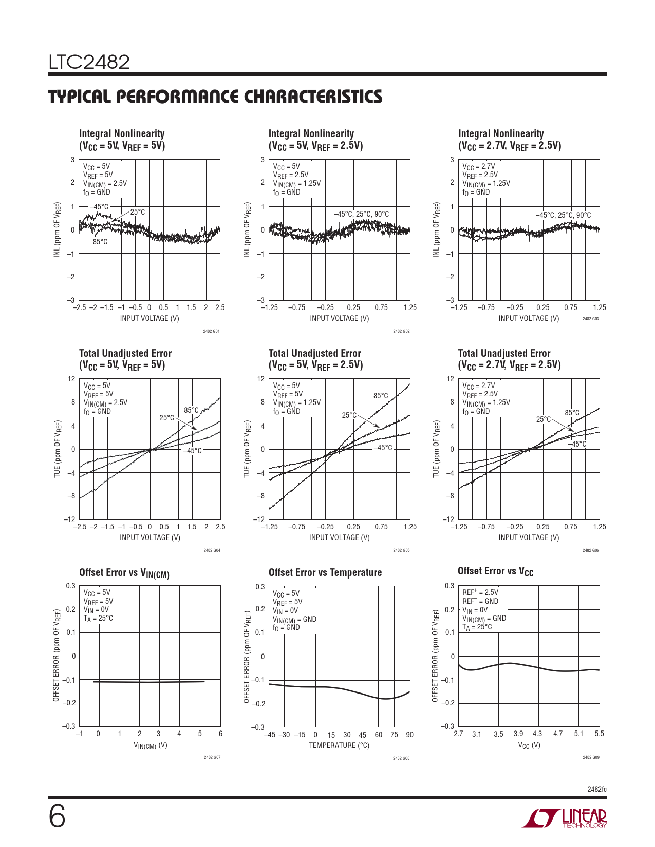 12 12 12 VCC = 5V VCC = 5V VCC = 2.7V VREF = 5V VREF = 5V 85°C VREF = 2.5V 8 VIN(CM) = 2.5V 8 VIN(CM) = 1.25V 8 VIN(CM) = 1.25V fO = GND 85°C fO = GND f 25°C O = GND 85°C ) 25°C ) 25°C 4 4 4 REF REF REF –45°C 0 –45°C 0 –45°C 0 TUE (ppm OF V –4 TUE (ppm OF V –4 TUE (ppm OF V –4 –8 –8 –8 –12 –12 –12 –2.5 –2 –1.5 –1 –0.5 0 0.5 1 1.5 2 2.5 –1.25 –0.75 –0.25 0.25 0.75 1.25 –1.25 –0.75 –0.25 0.25 0.75 1.25 INPUT VOLTAGE (V) INPUT VOLTAGE (V) INPUT VOLTAGE (V) 2482 G04 2482 G05 2482 G06