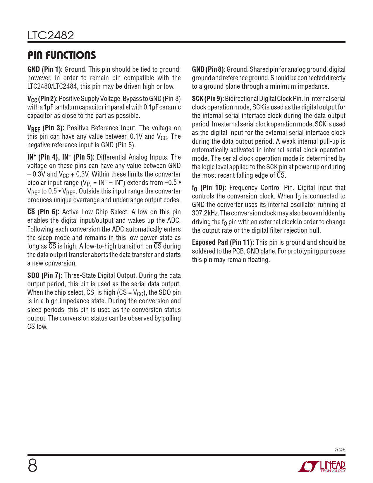 Three-State Digital Output. During the data output period, this pin is used as the serial data output. When the chip select, CS, is high (CS = VCC), the SDO pin is in a high impedance state. During the conversion and sleep periods, this pin is used as the conversion status output. The conversion status can be observed by pulling CS low. 2482fc 8