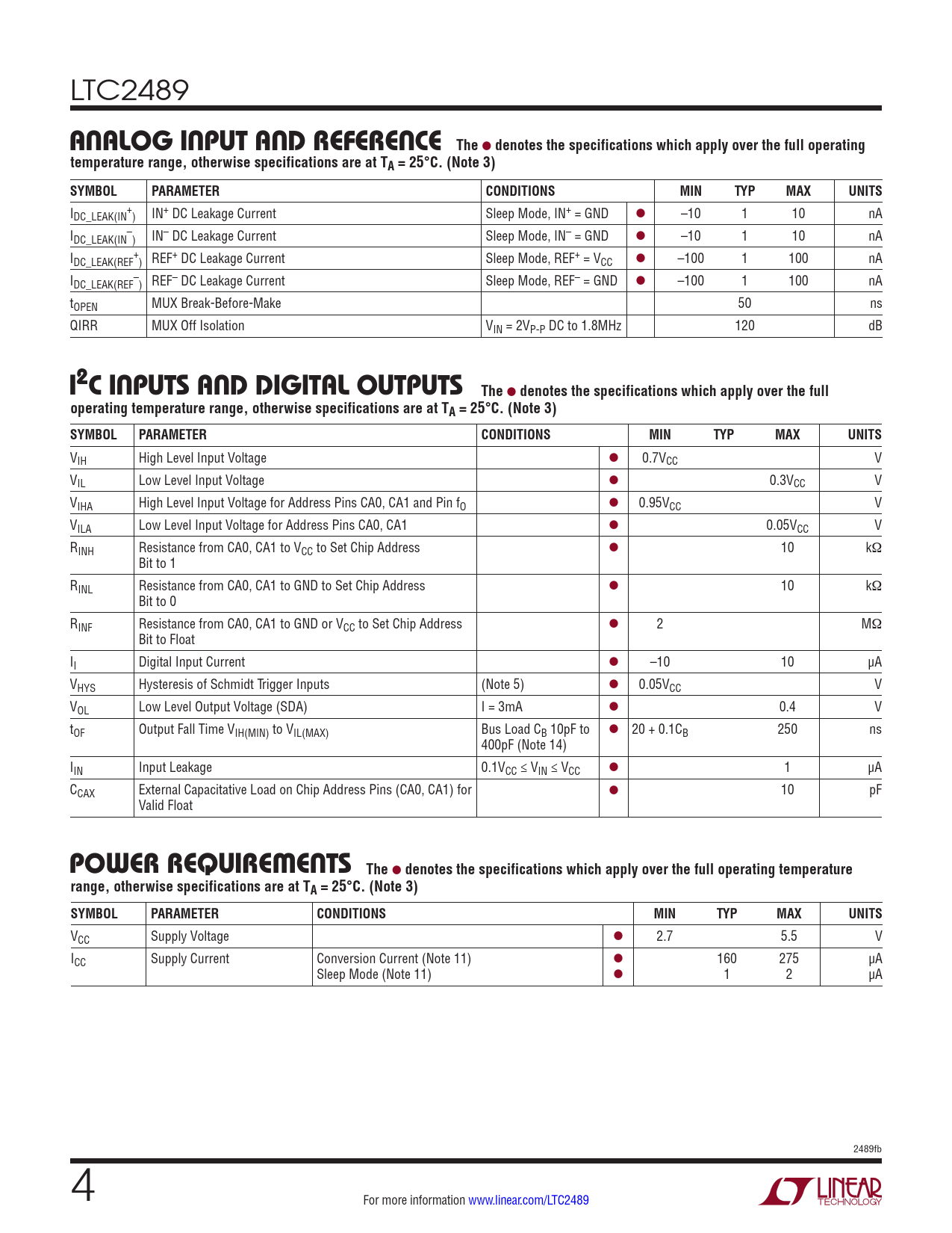 VCC Supply Voltage l 2.7 5.5 V ICC Supply Current Conversion Current (Note 11) l 160 275 µA Sleep Mode (Note 11) l 1 2 µA 2489fb 4 For more information www.linear.com/LTC2489 Document Outline Features Applications Typical Application Description Absolute Maximum Ratings Order Information Pin Configuration Electrical Characteristics Converter Characteristics Analog Input and Reference I2C Inputs and Digital Outputs Power Requirements Digital Inputs and Digital Outputs I2C Timing Characteristics Typical Performance Characteristics Pin Functions Functional Block Diagram Applications Information Package Description Revision History Typical Application Related Parts