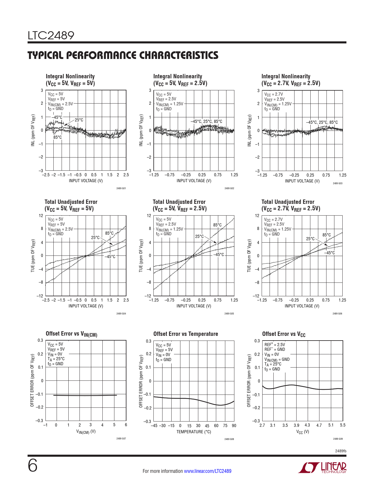 3 3 3 VCC = 5V VCC = 5V VCC = 2.7V VREF = 5V VREF = 2.5V VREF = 2.5V 2 VIN(CM) = 2.5V 2 VIN(CM) = 1.25V 2 VIN(CM) = 1.25V fO = GND fO = GND fO = GND ) 1 –45°C 1 1 REF 25°C REF –45°C, 25°C, 85°C REF –45°C, 25°C, 85°C 0 0 0 85°C INL (ppm OF V –1 INL (ppm OF V –1 INL (ppm OF V –1 –2 –2 –2 –3 –3 –3 –2.5 –2 –1.5 –1 –0.5 0 0.5 1 1.5 2 2.5 –1.25 –0.75 –0.25 0.25 0.75 1.25 –1.25 –0.75 –0.25 0.25 0.75 1.25 INPUT VOLTAGE (V) INPUT VOLTAGE (V) INPUT VOLTAGE (V) 2489 G03 2489 G01 2489 G02