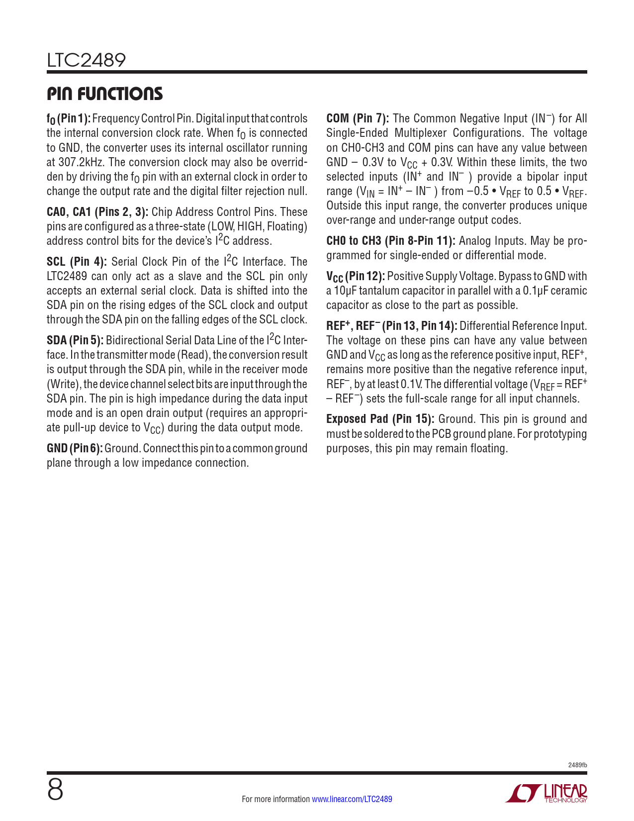 LTC2489 pin FuncTions fO (Pin 1): Frequency Control Pin. Digital input that controls COM (Pin 7): The Common Negative Input (IN–) for All the internal conversion clock rate. When fO is connected Single-Ended Multiplexer Configurations. The voltage to GND, the converter uses its internal oscillator running on CH0-CH3 and COM pins can have any value between at 307.2kHz. The conversion clock may also be overrid- GND – 0.3V to VCC + 0.3V. Within these limits, the two den by driving the fO pin with an external clock in order to selected inputs (IN+ and IN– ) provide a bipolar input change the output rate and the digital filter rejection null. range (VIN = IN+ – IN– ) from –0.5 • VREF to 0.5 • VREF. CA0, CA1 (Pins 2, 3): Chip Address Control Pins. These Outside this input range, the converter produces unique pins are configured as a three-state (LOW, HIGH, Floating) over-range and under-range output codes. address control bits for the device’s I2C address. CH0 to CH3 (Pin 8-Pin 11): Analog Inputs. May be pro- SCL (Pin 4): Serial Clock Pin of the I2C Interface. The grammed for single-ended or differential mode. LTC2489 can only act as a slave and the SCL pin only VCC (Pin 12): Positive Supply Voltage. Bypass to GND with accepts an external serial clock. Data is shifted into the a 10µF tantalum capacitor in parallel with a 0.1µF ceramic SDA pin on the rising edges of the SCL clock and output capacitor as close to the part as possible. through the SDA pin on the falling edges of the SCL clock. REF+, REF– (Pin 13, Pin 14): Differential Reference Input. SDA (Pin 5): Bidirectional Serial Data Line of the I2C Inter- The voltage on these pins can have any value between face. In the transmitter mode (Read), the conversion result GND and VCC as long as the reference positive input, REF+, is output through the SDA pin, while in the receiver mode remains more positive than the negative reference input, (Write), the device channel select bits are input through the REF–, by at least 0.1V. The differential voltage (VREF = REF+ SDA pin. The pin is high impedance during the data input – REF–) sets the full-scale range for all input channels. mode and is an open drain output (requires an appropri- Exposed Pad (Pin 15): Ground. This pin is ground and ate pull-up device to VCC) during the data output mode. must be soldered to the PCB ground plane. For prototyping GND (Pin 6): Ground. Connect this pin to a common ground purposes, this pin may remain floating. plane through a low impedance connection. 2489fb 8 For more information www.linear.com/LTC2489 Document Outline Features Applications Typical Application Description Absolute Maximum Ratings Order Information Pin Configuration Electrical Characteristics Converter Characteristics Analog Input and Reference I2C Inputs and Digital Outputs Power Requirements Digital Inputs and Digital Outputs I2C Timing Characteristics Typical Performance Characteristics Pin Functions Functional Block Diagram Applications Information Package Description Revision History Typical Application Related Parts