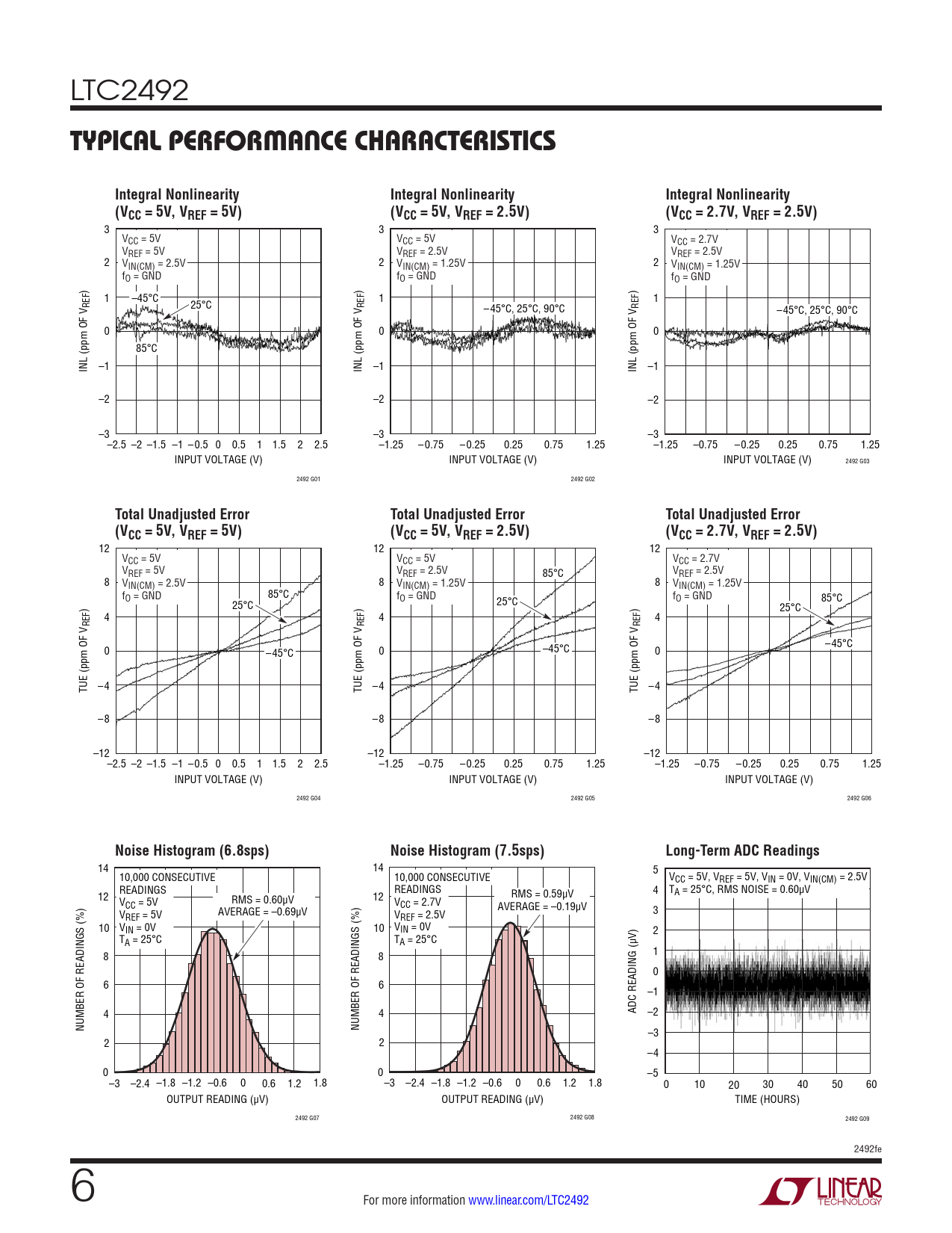 3 3 3 VCC = 5V VCC = 5V VCC = 2.7V VREF = 5V VREF = 2.5V VREF = 2.5V 2 VIN(CM) = 2.5V 2 VIN(CM) = 1.25V 2 VIN(CM) = 1.25V fO = GND fO = GND fO = GND ) 1 –45°C 1 1 REF 25°C REF –45°C, 25°C, 90°C REF –45°C, 25°C, 90°C 0 0 0 85°C INL (ppm OF V –1 INL (ppm OF V –1 INL (ppm OF V –1 –2 –2 –2 –3 –3 –3 –2.5 –2 –1.5 –1 –0.5 0 0.5 1 1.5 2 2.5 –1.25 –0.75 –0.25 0.25 0.75 1.25 –1.25 –0.75 –0.25 0.25 0.75 1.25 INPUT VOLTAGE (V) INPUT VOLTAGE (V) INPUT VOLTAGE (V) 2492 G03 2492 G01 2492 G02