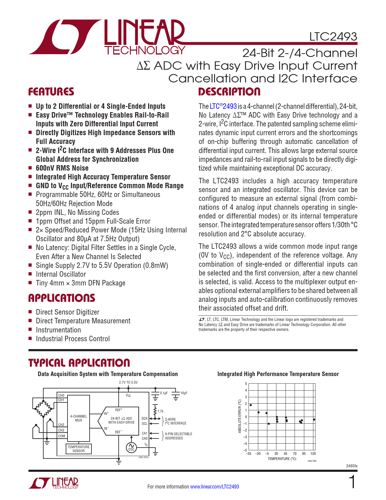 LTC2493 24-Bit 2-/4-Channel ∆∑ ADC with Easy Drive Input Current Cancellation and I2C Interface FeaTuresDescripTion n Up to 2 Differential or 4 Single-Ended Inputs The LTC®2493 is a 4-channel (2-channel differential), 24-bit, n Easy Drive™ Technology Enables Rail-to-Rail No Latency ∆∑™ ADC with Easy Drive technology and a Inputs with Zero Differential Input Current 2-wire, I2C interface. The patented sampling scheme elimi- n Directly Digitizes High Impedance Sensors with nates dynamic input current errors and the shortcomings Full Accuracy of on-chip buffering through automatic cancellation of n 2-Wire I2C Interface with 9 Addresses Plus One differential input current. This allows large external source Global Address for Synchronization impedances and rail-to-rail input signals to be directly digi- n 600nV RMS Noise tized while maintaining exceptional DC accuracy. n Integrated High Accuracy Temperature Sensor The LTC2493 includes a high accuracy temperature n GND to VCC Input/Reference Common Mode Range sensor and an integrated oscillator. This device can be n Programmable 50Hz, 60Hz or Simultaneous configured to measure an external signal (from combi- 50Hz/60Hz Rejection Mode nations of 4 analog input channels operating in single- n 2ppm INL, No Missing Codes ended or differential modes) or its internal temperature n 1ppm Offset and 15ppm Full-Scale Error sensor. The integrated temperature sensor offers 1/30th °C n 2× Speed/Reduced Power Mode (15Hz Using Internal resolution and 2°C absolute accuracy. Oscillator and 80µA at 7.5Hz Output) n No Latency: Digital Filter Settles in a Single Cycle, The LTC2493 allows a wide common mode input range Even After a New Channel Is Selected (0V to VCC), independent of the reference voltage. Any n Single Supply 2.7V to 5.5V Operation (0.8mW) combination of single-ended or differential inputs can n Internal Oscillator be selected and the first conversion, after a new channel n Tiny 4mm × 3mm DFN Package is selected, is valid. Access to the multiplexer output en- ables optional external amplifiers to be shared between all applicaTions analog inputs and auto-calibration continuously removes their associated offset and drift. n Direct Sensor Digitizer n Direct Temperature Measurement L, LT, LTC, LTM, Linear Technology and the Linear logo are registered trademarks and No Latency ∆∑ and Easy Drive are trademarks of Linear Technology Corporation. All other n Instrumentation trademarks are the property of their respective owners. n Industrial Process Control Typical applicaTionData Acquisition System with Temperature CompensationIntegrated High Performance Temperature Sensor 2.7V TO 5.5V 5 4 10µF CH0 V 0.1µF CC 3 CH1 2 REF+ 1.7k 1 IN+ 4-CHANNEL 24-BIT ∆∑ ADC SDA 0 MUX 2-WIRE WITH EASY-DRIVE SCL I2C INTERFACE CH2 –1 IN– CH3 REF– –2 CA1 ABSOLUTE ERROR (°C) COM 9-PIN SELECTABLE CA0 ADDRESSES –3 f –4 TEMPERATURE O SENSOR OSC –5–55 –30 –5 20 45 70 95 120 2493 vTA01a TEMPERATURE (°C) 2493 TA02 2493fe For more information www.linear.com/LTC2493 1 Document Outline Features Applications Typical Application Description Absolute Maximum Ratings Order Information Pin Configuration Electrical Characteristics (Normal Speed) Electrical Characteristics (2x Speed) Converter Characteristics Analog Input and Reference I2C Inputs and Digital Outputs Power Requirements Digital Inputs and Digital Outputs I2C Timing Characteristics Typical Performance Characteristics Pin Functions Functional Block Diagram Applications Information Package Description Revision History Typical Application Related Parts
