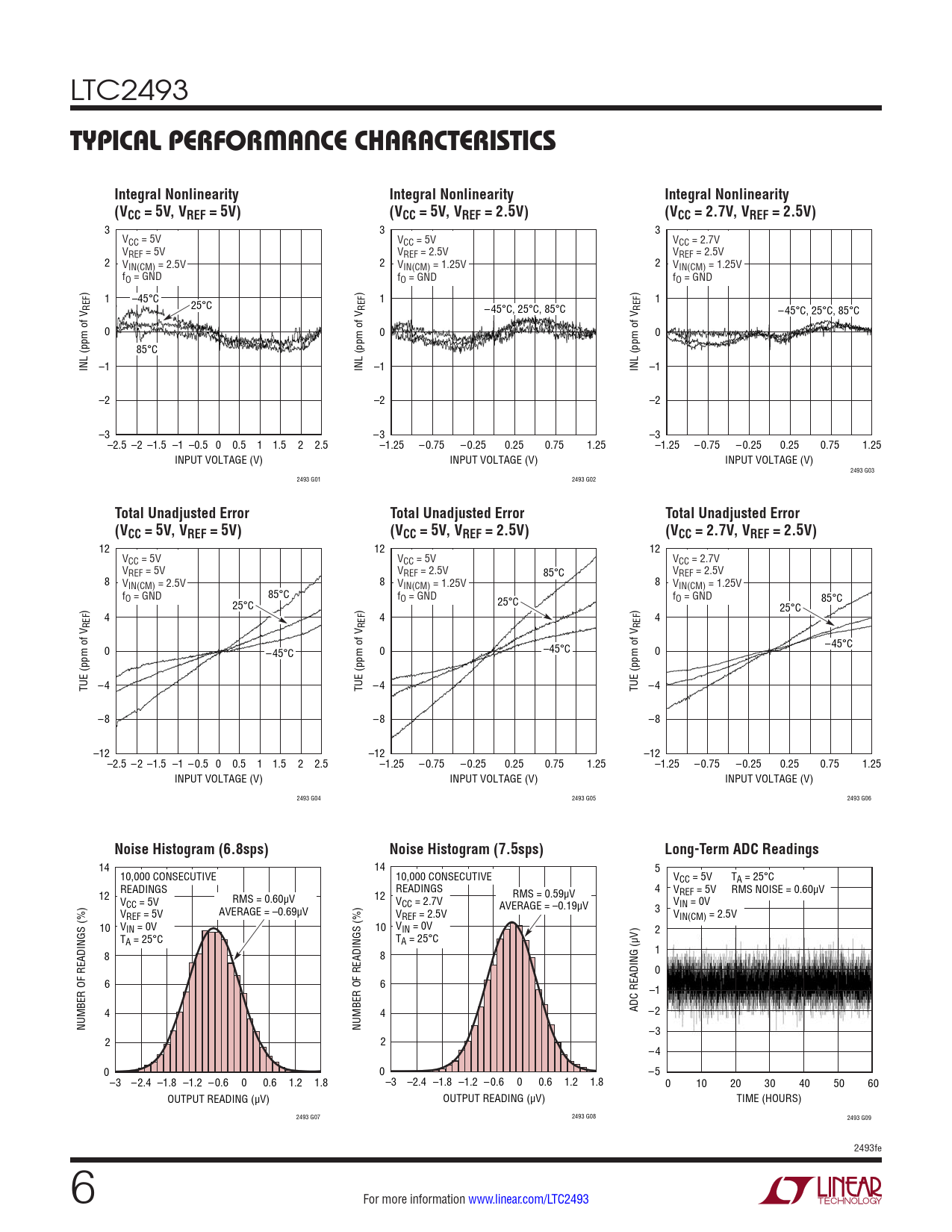 3 3 3 VCC = 5V VCC = 5V VCC = 2.7V VREF = 5V VREF = 2.5V VREF = 2.5V 2 VIN(CM) = 2.5V 2 VIN(CM) = 1.25V 2 VIN(CM) = 1.25V fO = GND fO = GND fO = GND ) 1 –45°C ) 1 ) 1 REF 25°C REF –45°C, 25°C, 85°C REF –45°C, 25°C, 85°C 0 0 0 85°C INL (ppm of V –1 INL (ppm of V –1 INL (ppm of V –1 –2 –2 –2 –3 –3 –3 –2.5 –2 –1.5 –1 –0.5 0 0.5 1 1.5 2 2.5 –1.25 –0.75 –0.25 0.25 0.75 1.25 –1.25 –0.75 –0.25 0.25 0.75 1.25 INPUT VOLTAGE (V) INPUT VOLTAGE (V) INPUT VOLTAGE (V) 2493 G03 2493 G01 2493 G02