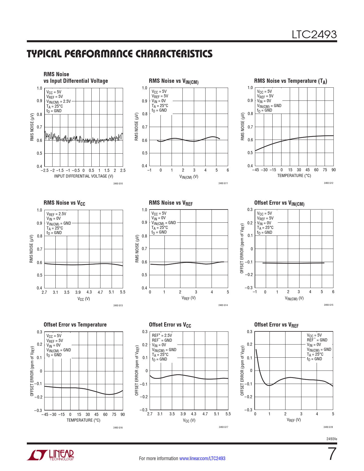 1.0 1.0 1.0 VCC = 5V VCC = 5V VCC = 5V VREF = 5V VREF = 5V VREF = 5V 0.9 VIN(CM) = 2.5V 0.9 VIN = 0V 0.9 VIN = 0V TA = 25°C TA = 25°C VIN(CM) = GND f fO = GND fO = GND 0.8 O = GND 0.8 0.8 0.7 0.7 0.7 RMS NOISE (µV) 0.6 RMS NOISE (µV) 0.6 RMS NOISE (µV) 0.6 0.5 0.5 0.5 0.4 0.4 0.4 –2.5 –2 –1.5 –1 –0.5 0 0.5 1 1.5 2 2.5 –1 0 1 2 3 4 5 6 –45 –30 –15 0 15 30 45 60 75 90 INPUT DIFFERENTIAL VOLTAGE (V) VIN(CM) (V) TEMPERATURE (°C) 2493 G10 2493 G11 2493 G12