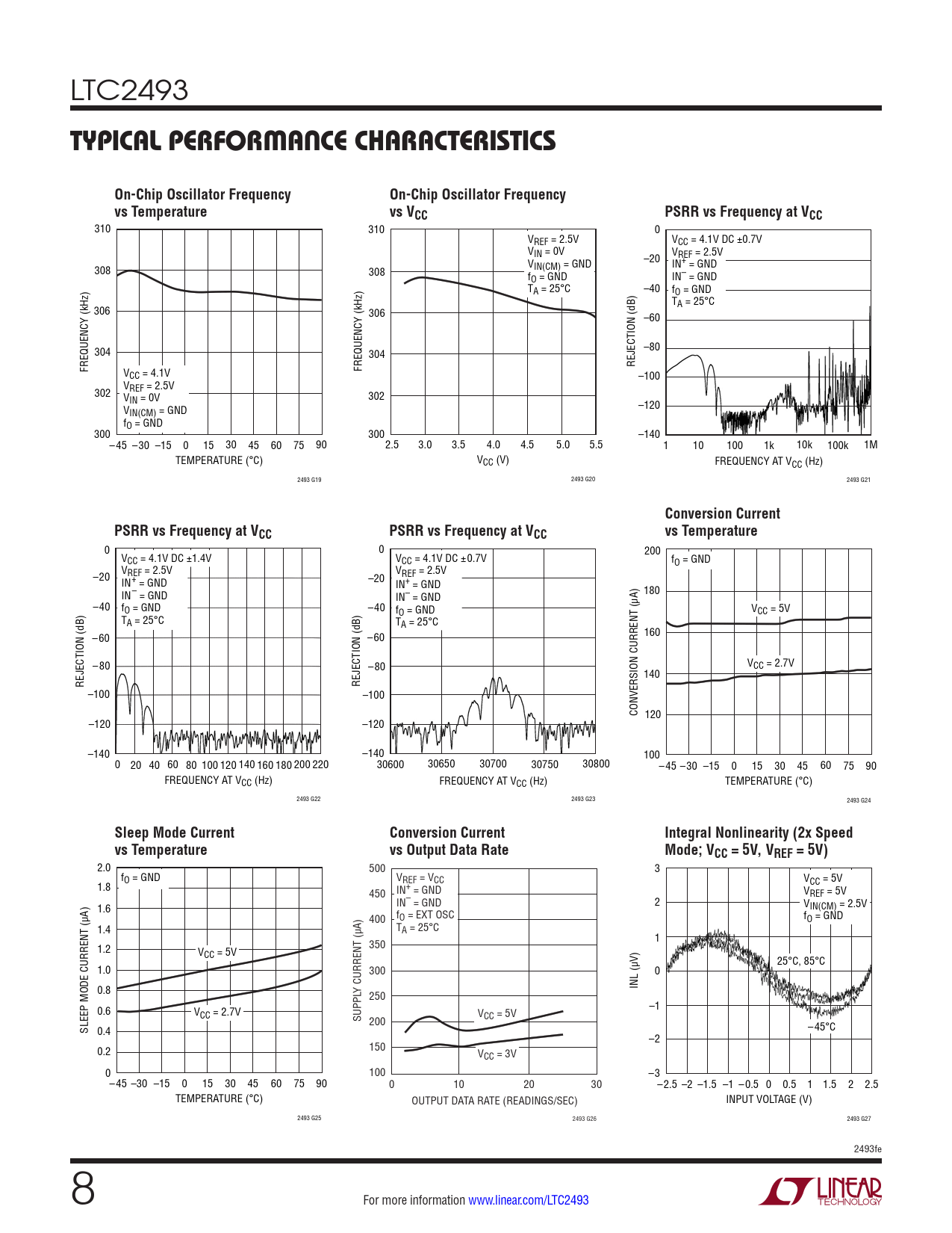 310 310 0 VREF = 2.5V VCC = 4.1V DC ±0.7V VIN = 0V V –20 REF = 2.5V 308 V IN+ = GND 308 IN(CM) = GND fO = GND IN– = GND TA = 25°C –40 fO = GND T 306 A = 25°C 306 –60 304 –80 304 FREQUENCY (kHz) REJECTION (dB) V FREQUENCY (kHz) CC = 4.1V –100 V 302 REF = 2.5V VIN = 0V 302 V –120 IN(CM) = GND fO = GND 300 300 –140 –45 –30 –15 0 15 30 45 60 75 90 2.5 3.0 3.5 4.0 4.5 5.0 5.5 1 10 100 1k 10k 100k 1M TEMPERATURE (°C) VCC (V) FREQUENCY AT VCC (Hz) 2493 G19 2493 G20 2493 G21