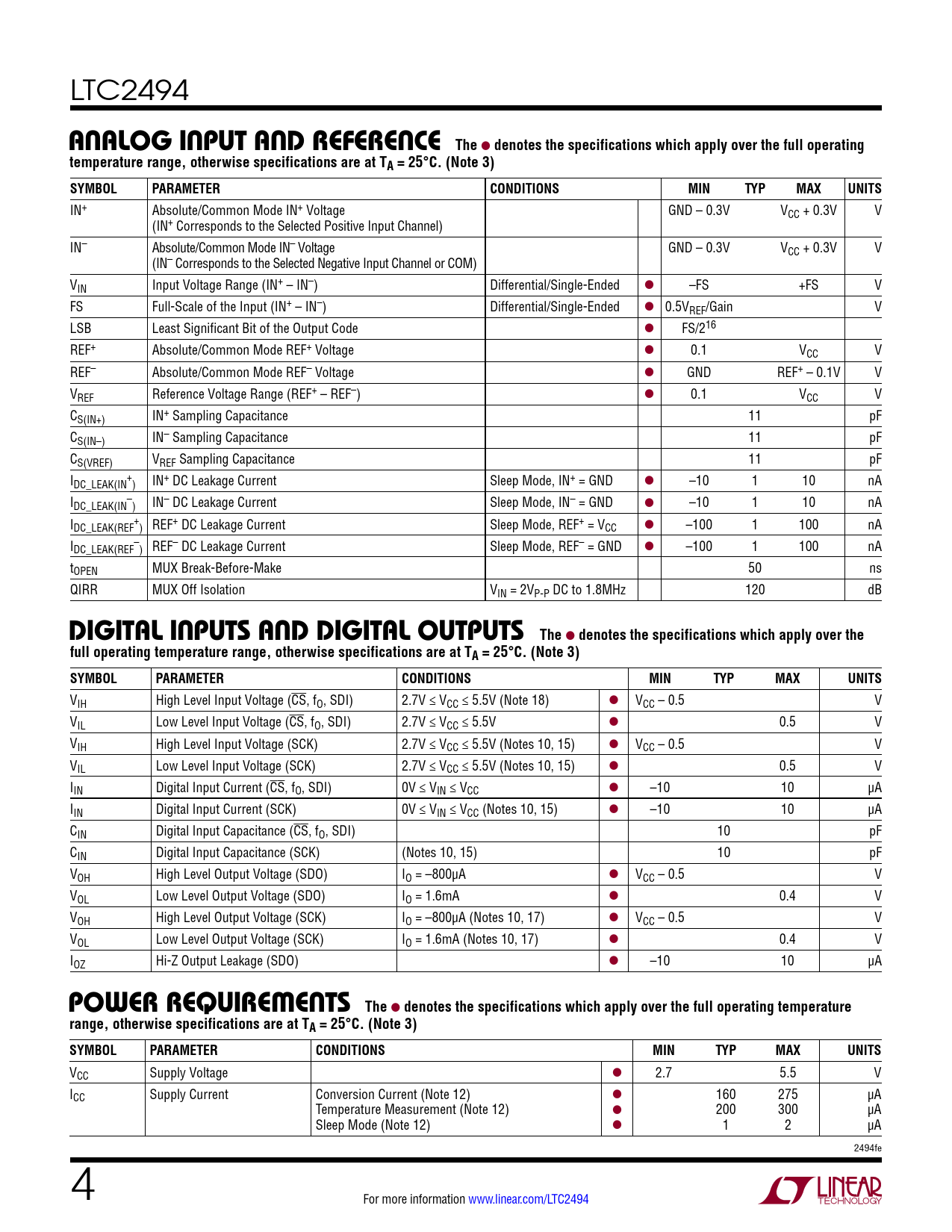 VCC Supply Voltage l 2.7 5.5 V ICC Supply Current Conversion Current (Note 12) l 160 275 µA Temperature Measurement (Note 12) l 200 300 µA Sleep Mode (Note 12) l 1 2 µA 2494fe 4 For more information www.linear.com/LTC2494