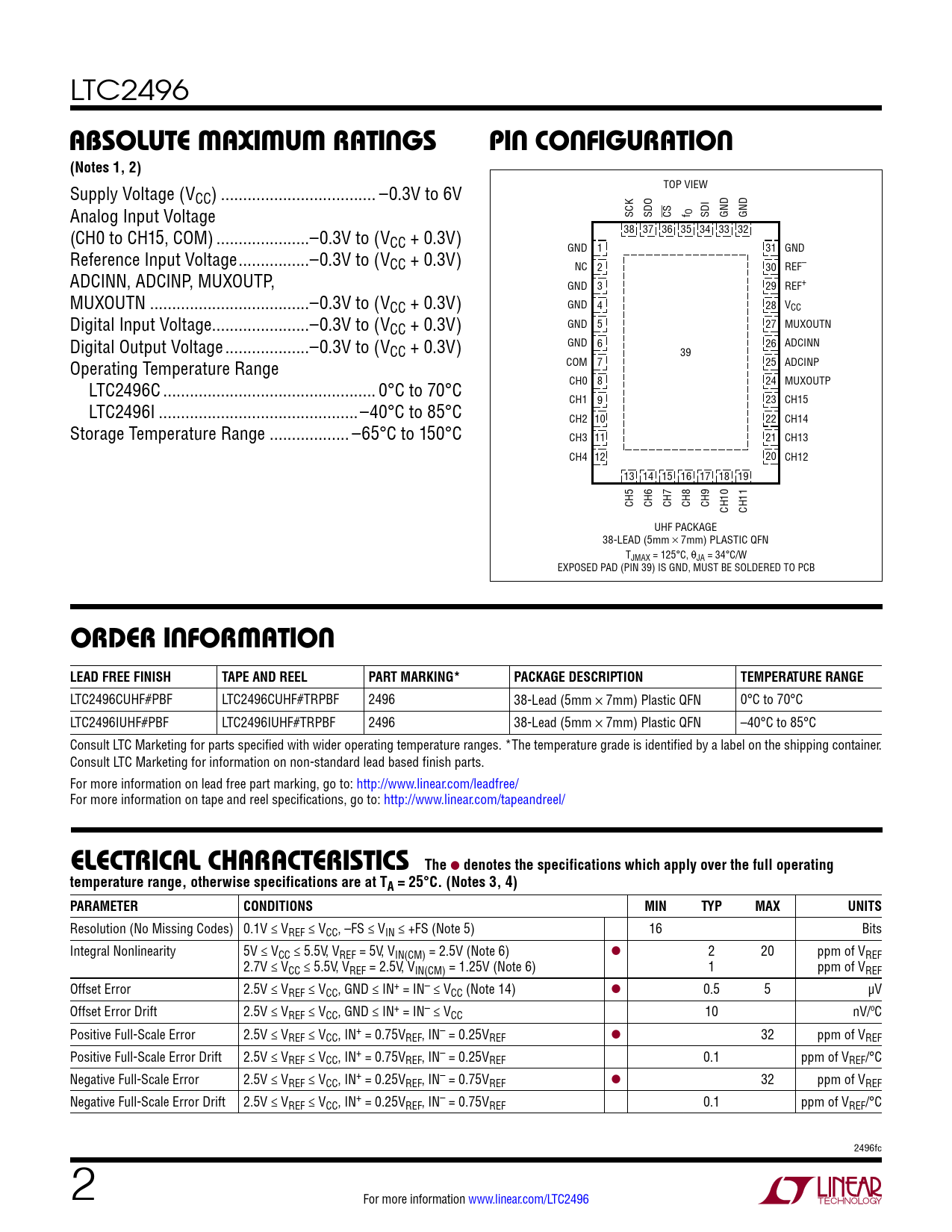 LTC2496CUHF#PBF LTC2496CUHF#TRPBF 2496 38-Lead (5mm × 7mm) Plastic QFN 0°C to 70°C LTC2496IUHF#PBF LTC2496IUHF#TRPBF 2496 38-Lead (5mm × 7mm) Plastic QFN –40°C to 85°C Consult LTC Marketing for parts specified with wider operating temperature ranges. *The temperature grade is identified by a label on the shipping container. Consult LTC Marketing for information on non-standard lead based finish parts. For more information on lead free part marking, go to: http://www.linear.com/leadfree/ For more information on tape and reel specifications, go to: http://www.linear.com/tapeandreel/