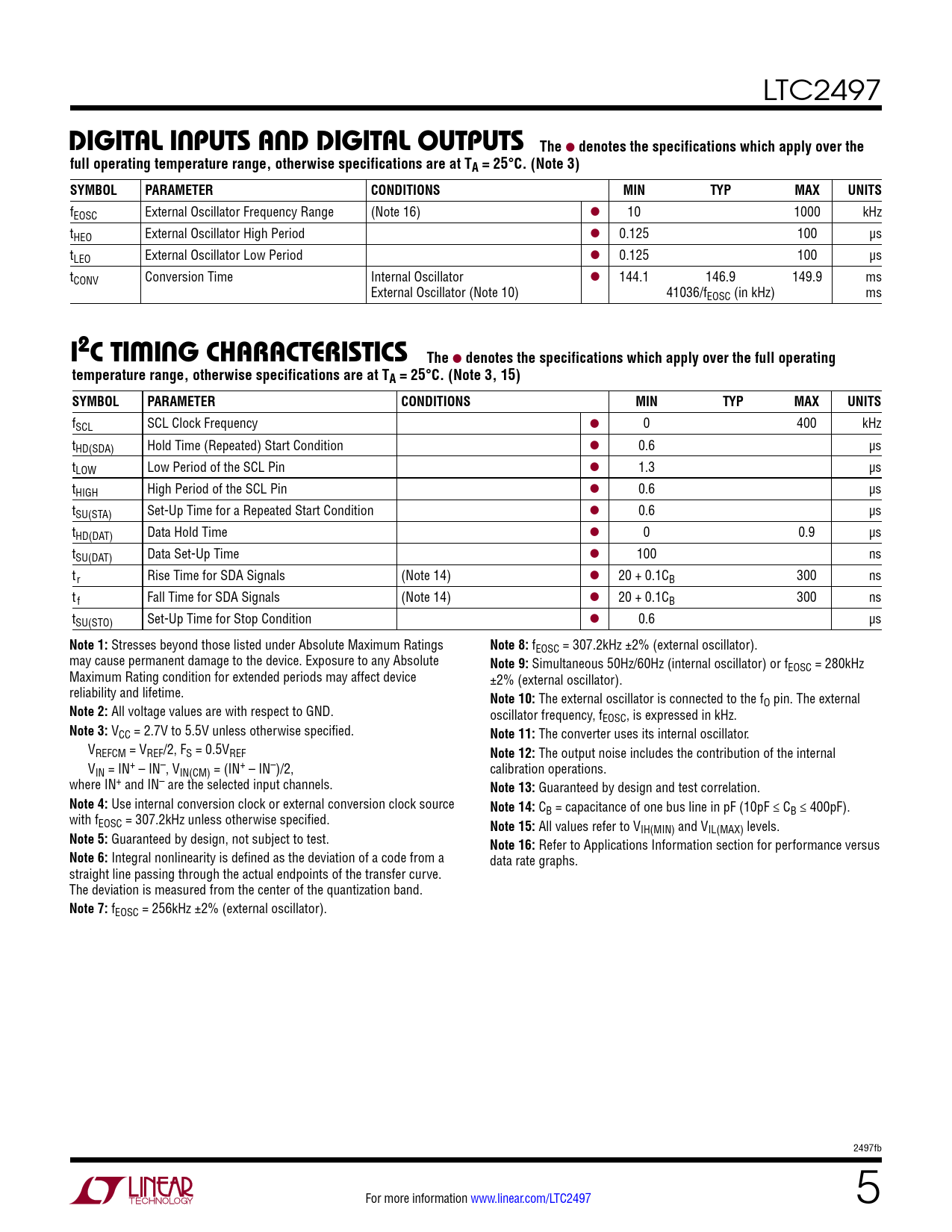 fEOSC = 256kHz ±2% (external oscillator). 2497fb For more information www.linear.com/LTC2497 5 Document Outline Features Applications Description Typical Application Absolute Maximum Ratings Pin Configuration Order Information Electrical Characteristics Converter Characteristics Analog Input and Reference I2C Inputs And Digital Outputs Power Requirements Digital Inputs And Digital Outputs I2C Timing Characteristics Typical Performance Characteristics Pin Functions Functional Block Diagram Applications Information Package Description Revision History Typical Application Related Parts