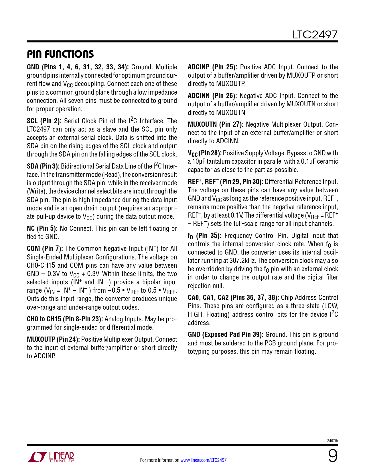 LTC2497 pin FuncTions GND (Pins 1, 4, 6, 31, 32, 33, 34): Ground. Multiple ADCINP (Pin 25): Positive ADC Input. Connect to the ground pins internally connected for optimum ground cur- output of a buffer/amplifier driven by MUXOUTP or short rent flow and VCC decoupling. Connect each one of these directly to MUXOUTP. pins to a common ground plane through a low impedance ADCINN (Pin 26): Negative ADC Input. Connect to the connection. All seven pins must be connected to ground output of a buffer/amplifier driven by MUXOUTN or short for proper operation. directly to MUXOUTN SCL (Pin 2): Serial Clock Pin of the I2C Interface. The MUXOUTN (Pin 27): Negative Multiplexer Output. Con- LTC2497 can only act as a slave and the SCL pin only nect to the input of an external buffer/amplifier or short accepts an external serial clock. Data is shifted into the directly to ADCINN. SDA pin on the rising edges of the SCL clock and output through the SDA pin on the falling edges of the SCL clock. VCC (Pin 28): Positive Supply Voltage. Bypass to GND with a 10µF tantalum capacitor in parallel with a 0.1µF ceramic SDA (Pin 3): Bidirectional Serial Data Line of the I2C Inter- capacitor as close to the part as possible. face. In the transmitter mode (Read), the conversion result is output through the SDA pin, while in the receiver mode REF+, REF– (Pin 29, Pin 30): Differential Reference Input. (Write), the device channel select bits are input through the The voltage on these pins can have any value between SDA pin. The pin is high impedance during the data input GND and VCC as long as the reference positive input, REF+, mode and is an open drain output (requires an appropri- remains more positive than the negative reference input, ate pull-up device to VCC) during the data output mode. REF–, by at least 0.1V. The differential voltage (VREF = REF+ – REF–) sets the full-scale range for all input channels. NC (Pin 5): No Connect. This pin can be left floating or tied to GND. fO (Pin 35): Frequency Control Pin. Digital input that controls the internal conversion clock rate. When f COM (Pin 7): The Common Negative Input (IN–) for All O is connected to GND, the converter uses its internal oscil- Single-Ended Multiplexer Configurations. The voltage on lator running at 307.2kHz. The conversion clock may also CH0-CH15 and COM pins can have any value between be overridden by driving the f GND – 0.3V to V O pin with an external clock CC + 0.3V. Within these limits, the two in order to change the output rate and the digital filter selected inputs (IN+ and IN– ) provide a bipolar input rejection null. range (VIN = IN+ – IN– ) from –0.5 • VREF to 0.5 • VREF. Outside this input range, the converter produces unique CA0, CA1, CA2 (Pins 36, 37, 38): Chip Address Control over-range and under-range output codes. Pins. These pins are configured as a three-state (LOW, HIGH, Floating) address control bits for the device I2C CH0 to CH15 (Pin 8-Pin 23): Analog Inputs. May be pro- address. grammed for single-ended or differential mode. GND (Exposed Pad Pin 39): Ground. This pin is ground MUXOUTP (Pin 24): Positive Multiplexer Output. Connect and must be soldered to the PCB ground plane. For pro- to the input of external buffer/amplifier or short directly totyping purposes, this pin may remain floating. to ADCINP. 2497fb For more information www.linear.com/LTC2497 9 Document Outline Features Applications Description Typical Application Absolute Maximum Ratings Pin Configuration Order Information Electrical Characteristics Converter Characteristics Analog Input and Reference I2C Inputs And Digital Outputs Power Requirements Digital Inputs And Digital Outputs I2C Timing Characteristics Typical Performance Characteristics Pin Functions Functional Block Diagram Applications Information Package Description Revision History Typical Application Related Parts
