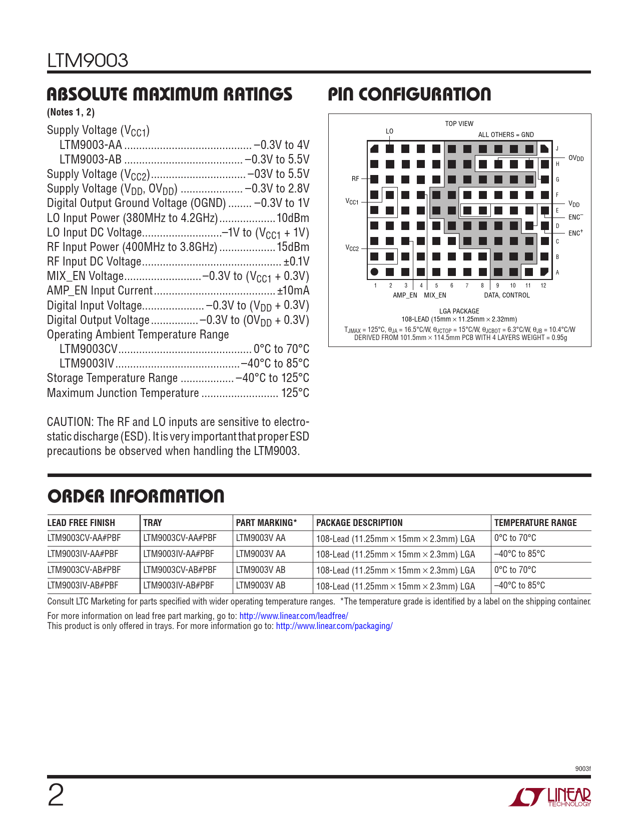 LTM9003 absoluTe MaxiMuM raTings pin conFiguraTion