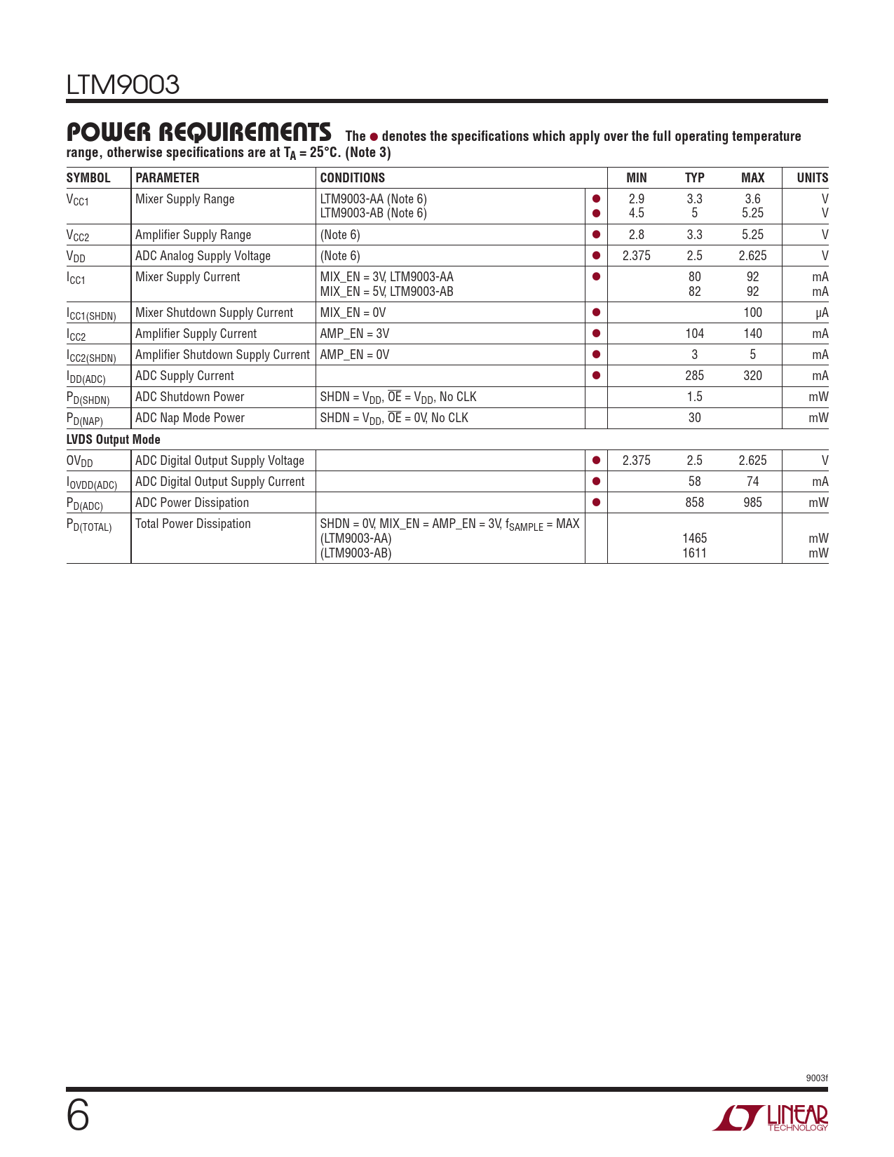 LTM9003 p ower requireMenTs The l denotes the specifications which apply over the full operating temperaturerange, otherwise specifications are at TA = 25°C. (Note 3) SYMBOLPARAMETERCONDITIONSMINTYPMAXUNITS VCC1 Mixer Supply Range LTM9003-AA (Note 6) l 2.9 3.3 3.6 V LTM9003-AB (Note 6) l 4.5 5 5.25 V VCC2 Amplifier Supply Range (Note 6) l 2.8 3.3 5.25 V VDD ADC Analog Supply Voltage (Note 6) l 2.375 2.5 2.625 V ICC1 Mixer Supply Current MIX_EN = 3V, LTM9003-AA l 80 92 mA MIX_EN = 5V, LTM9003-AB 82 92 mA ICC1(SHDN) Mixer Shutdown Supply Current MIX_EN = 0V l 100 µA ICC2 Amplifier Supply Current AMP_EN = 3V l 104 140 mA ICC2(SHDN) Amplifier Shutdown Supply Current AMP_EN = 0V l 3 5 mA IDD(ADC) ADC Supply Current l 285 320 mA PD(SHDN) ADC Shutdown Power SHDN = VDD, OE = VDD, No CLK 1.5 mW PD(NAP) ADC Nap Mode Power SHDN = VDD, OE = 0V, No CLK 30 mW LVDS Output Mode OVDD ADC Digital Output Supply Voltage l 2.375 2.5 2.625 V IOVDD(ADC) ADC Digital Output Supply Current l 58 74 mA PD(ADC) ADC Power Dissipation l 858 985 mW PD(TOTAL) Total Power Dissipation SHDN = 0V, MIX_EN = AMP_EN = 3V, fSAMPLE = MAX (LTM9003-AA) 1465 mW (LTM9003-AB) 1611 mW 9003f Document Outline Features Applications Description Typical Application Absolute Maximum Ratings Pin Configuration Order Information Electrical Characteristics Converter Characteristics Filter Characteristics Dynamic Accuracy Digital Inputs and Outputs Power Requirements Timing Characteristics Timing Diagram Typical Performance Characteristics Pin Functions Block Diagram Operation Applications Information Package Description Related Parts