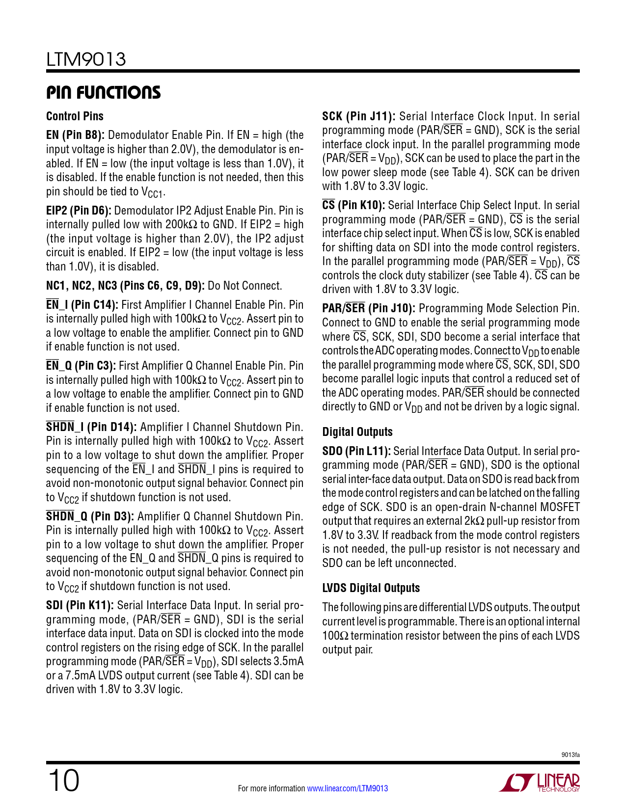 Serial Interface Data Input. In serial pro- The following pins are differential LVDS outputs. The output gramming mode, (PAR/SER = GND), SDI is the serial current level is programmable. There is an optional internal interface data input. Data on SDI is clocked into the mode 100Ω termination resistor between the pins of each LVDS control registers on the rising edge of SCK. In the parallel output pair. programming mode (PAR/SER = VDD), SDI selects 3.5mA or a 7.5mA LVDS output current (see Table 4). SDI can be driven with 1.8V to 3.3V logic. 9013fa 10 For more information www.linear.com/LTM9013 Document Outline Features Applications Description Typical Application Absolute Maximum Ratings Pin Configuration Order Information Electrical Characteristics Dynamic Accuracy Analog Inputs and Outputs Digital Inputs and Outputs Power Requirements Timing Characteristics Typical Performance Characteristics Pin Functions Block Diagram Timing Diagrams Operation Applications Information Typical Applications Package Description Revision History Typical Application Related Parts