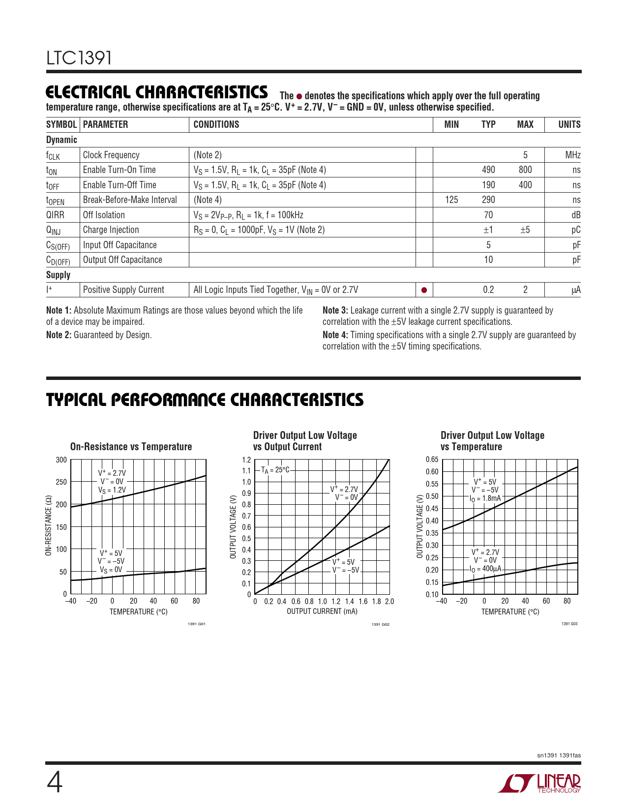 fCLK Clock Frequency (Note 2) 5 MHz tON Enable Turn-On Time VS = 1.5V, RL = 1k, CL = 35pF (Note 4) 490 800 ns tOFF Enable Turn-Off Time VS = 1.5V, RL = 1k, CL = 35pF (Note 4) 190 400 ns tOPEN Break-Before-Make Interval (Note 4) 125 290 ns QIRR Off Isolation VS = 2VP–P, RL = 1k, f = 100kHz 70 dB QINJ Charge Injection RS = 0, CL = 1000pF, VS = 1V (Note 2) ±1 ±5 pC CS(OFF) Input Off Capacitance 5 pF CD(OFF) Output Off Capacitance 10 pF