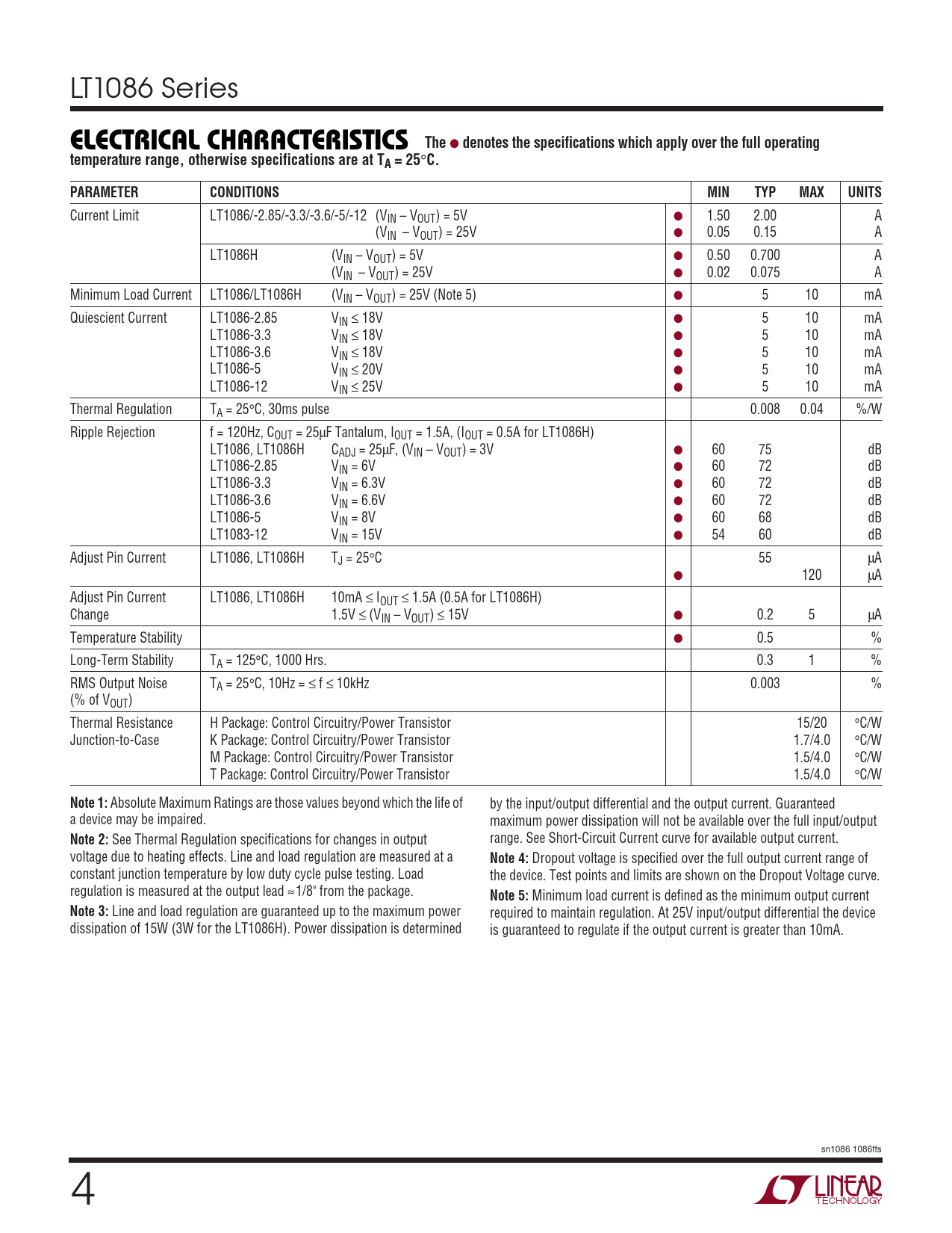 Current Limit LT1086/-2.85/-3.3/-3.6/-5/-12 (VIN – VOUT) = 5V ● 1.50 2.00 A (VIN – VOUT) = 25V ● 0.05 0.15 A LT1086H (VIN – VOUT) = 5V ● 0.50 0.700 A (VIN – VOUT) = 25V ● 0.02 0.075 A Minimum Load Current LT1086/LT1086H (VIN – VOUT) = 25V (Note 5) ● 5 10 mA Quiescient Current LT1086-2.85 VIN ≤ 18V ● 5 10 mA LT1086-3.3 VIN ≤ 18V ● 5 10 mA LT1086-3.6 VIN ≤ 18V ● 5 10 mA LT1086-5 VIN ≤ 20V ● 5 10 mA LT1086-12 VIN ≤ 25V ● 5 10 mA Thermal Regulation TA = 25°C, 30ms pulse 0.008 0.04 %/W Ripple Rejection f = 120Hz, COUT = 25µF Tantalum, IOUT = 1.5A, (IOUT = 0.5A for LT1086H) LT1086, LT1086H CADJ = 25µF, (VIN – VOUT) = 3V ● 60 75 dB LT1086-2.85 VIN = 6V ● 60 72 dB LT1086-3.3 VIN = 6.3V ● 60 72 dB LT1086-3.6 VIN = 6.6V ● 60 72 dB LT1086-5 VIN = 8V ● 60 68 dB LT1083-12 VIN = 15V ● 54 60 dB Adjust Pin Current LT1086, LT1086H TJ = 25°C 55 µA ● 120 µA Adjust Pin Current LT1086, LT1086H 10mA ≤ IOUT ≤ 1.5A (0.5A for LT1086H) Change 1.5V ≤ (VIN – VOUT) ≤ 15V ● 0.2 5 µA Temperature Stability ● 0.5 % Long-Term Stability TA = 125°C, 1000 Hrs. 0.3 1 % RMS Output Noise TA = 25°C, 10Hz = ≤ f ≤ 10kHz 0.003 % (% of VOUT) Thermal Resistance H Package: Control Circuitry/Power Transistor 15/20 °C/W Junction-to-Case K Package: Control Circuitry/Power Transistor 1.7/4.0 °C/W M Package: Control Circuitry/Power Transistor 1.5/4.0 °C/W T Package: Control Circuitry/Power Transistor 1.5/4.0 °C/W