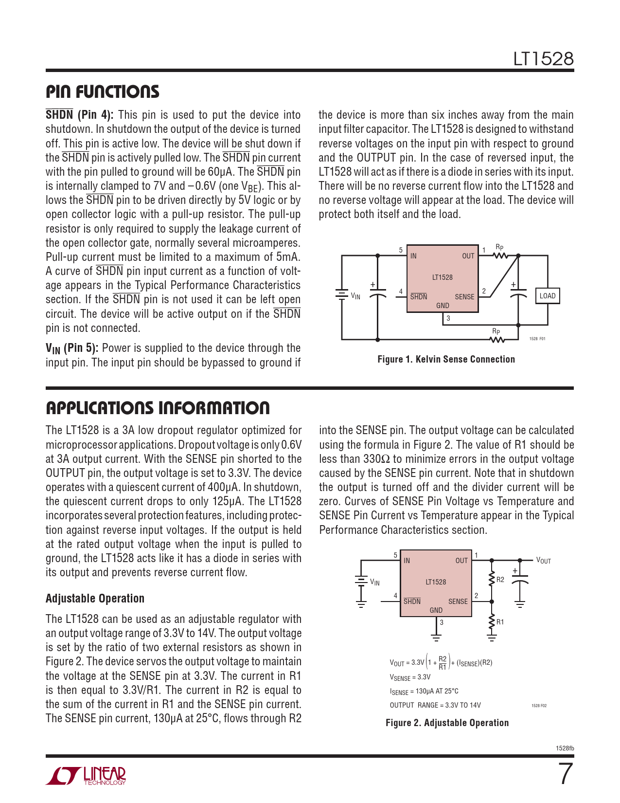 LT1528 PIN FUNCTIONS SHDN (Pin 4): This pin is used to put the device into the device is more than six inches away from the main shutdown. In shutdown the output of the device is turned input fi lter capacitor. The LT1528 is designed to withstand off. This pin is active low. The device will be shut down if reverse voltages on the input pin with respect to ground the SHDN pin is actively pulled low. The SHDN pin current and the OUTPUT pin. In the case of reversed input, the with the pin pulled to ground will be 60μA. The SHDN pin LT1528 will act as if there is a diode in series with its input. is internally clamped to 7V and – 0.6V (one VBE). This al- There will be no reverse current fl ow into the LT1528 and lows the SHDN pin to be driven directly by 5V logic or by no reverse voltage will appear at the load. The device will open collector logic with a pull-up resistor. The pull-up protect both itself and the load. resistor is only required to supply the leakage current of the open collector gate, normally several microamperes. R 5 1 P Pull-up current must be limited to a maximum of 5mA. IN OUT A curve of SHDN pin input current as a function of volt- LT1528 age appears in the Typical Performance Characteristics + + 4 2 section. If the SHDN pin is not used it can be left open VIN SHDN SENSE LOAD GND circuit. The device will be active output on if the SHDN 3 pin is not connected. RP 1528 F01 VIN (Pin 5): Power is supplied to the device through the input pin. The input pin should be bypassed to ground if Figure 1. Kelvin Sense ConnectionAPPLICATIONS INFORMATION The LT1528 is a 3A low dropout regulator optimized for into the SENSE pin. The output voltage can be calculated microprocessor applications. Dropout voltage is only 0.6V using the formula in Figure 2. The value of R1 should be at 3A output current. With the SENSE pin shorted to the less than 330Ω to minimize errors in the output voltage OUTPUT pin, the output voltage is set to 3.3V. The device caused by the SENSE pin current. Note that in shutdown operates with a quiescent current of 400μA. In shutdown, the output is turned off and the divider current will be the quiescent current drops to only 125μA. The LT1528 zero. Curves of SENSE Pin Voltage vs Temperature and incorporates several protection features, including protec- SENSE Pin Current vs Temperature appear in the Typical tion against reverse input voltages. If the output is held Performance Characteristics section. at the rated output voltage when the input is pulled to 5 1 ground, the LT1528 acts like it has a diode in series with IN OUT VOUT + its output and prevents reverse current fl ow. V R2 IN LT1528 4 2 Adjustable Operation SHDN SENSE GND The LT1528 can be used as an adjustable regulator with 3 R1 an output voltage range of 3.3V to 14V. The output voltage is set by the ratio of two external resistors as shown in R2 Figure 2. The device servos the output voltage to maintain VOUT = 3.3V 1 + + (ISENSE)(R2) R1 the voltage at the SENSE pin at 3.3V. The current in R1 VSENSE = 3.3V is then equal to 3.3V/R1. The current in R2 is equal to ISENSE = 130μA AT 25°C 1528 F02 the sum of the current in R1 and the SENSE pin current. OUTPUT RANGE = 3.3V TO 14V The SENSE pin current, 130μA at 25°C, fl ows through R2 Figure 2. Adjustable Operation 1528fb 7