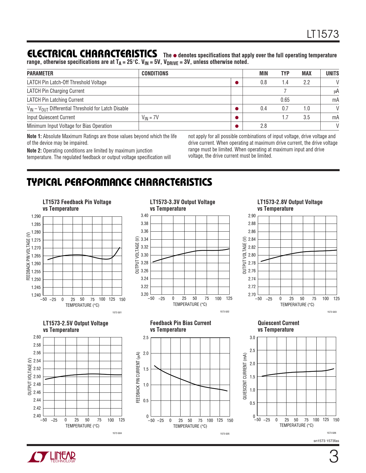 LT1573 ELECTRICAL CHARACTERISTICS The ● denotes specifications that apply over the full operating temperaturerange, otherwise specifications are at TA = 25 ° C. VIN = 5V, VDRIVE = 3V, unless otherwise noted.PARAMETERCONDITIONSMINTYPMAXUNITS LATCH Pin Latch-Off Threshold Voltage ● 0.8 1.4 2.2 V LATCH Pin Charging Current 7 µA LATCH Pin Latching Current 0.65 mA VIN – VOUT Differential Threshold for Latch Disable ● 0.4 0.7 1.0 V Input Quiescent Current VIN = 7V ● 1.7 3.5 mA Minimum Input Voltage for Bias Operation ● 2.8 V Note 1: Absolute Maximum Ratings are those values beyond which the life not apply for all possible combinations of input voltage, drive voltage and of the device may be impaired. drive current. When operating at maximum drive current, the drive voltage Note 2: Operating conditions are limited by maximum junction range must be limited. When operating at maximum input and drive temperature. The regulated feedback or output voltage specification will voltage, the drive current must be limited. WUTYPICAL PERFOR A CE CHARACTERISTICSLT1573 Feedback Pin VoltageLT1573-3.3V Output VoltageLT1573-2.8V Output Voltagevs Temperaturevs Temperaturevs Temperature 1.290 3.40 2.90 1.285 3.38 2.88 1.280 3.36 2.86 1.275 3.34 2.84 1.270 3.32 2.82 1.265 3.30 2.80 1.260 3.28 2.78 1.255 OUTPUT VOLTAGE (V) 3.26 OUTPUT VOLTAGE (V) 2.76 FEEDBACK PIN VOLTAGE (V) 1.250 3.24 2.74 1.245 3.22 2.72 1.240 3.20 2.70 –50 –25 0 25 50 75 100 125 150 –50 –25 0 25 50 75 100 125 –50 –25 0 25 50 75 100 125 TEMPERATURE (°C) TEMPERATURE (°C) TEMPERATURE (°C) 1573 G01 1573 G02 1573 G03 LT1573-2.5V Output VoltageFeedback Pin Bias CurrentQuiescent Currentvs Temperaturevs Temperaturevs Temperature 2.60 2.5 3.0 2.58 2.5 2.56 A) 2.0 µ 2.54 2.0 2.52 1.5 2.50 1.5 2.48 1.0 1.0 OUTPUT VOLTAGE (V) 2.46 QUIESCENT CURRENT (mA) 2.44 FEEDBACK PIN CURRENT ( 0.5 0.5 2.42 2.40 0 0 –50 –25 0 25 50 75 100 125 –50 100 125 –50 –25 0 25 50 75 150 –25 0 25 50 75 100 125 150 TEMPERATURE ( TEMPERATURE ( °C) TEMPERATURE ( °C) °C) 1573 G04 1573 G06 1573 G05 sn1573 1573fas 3