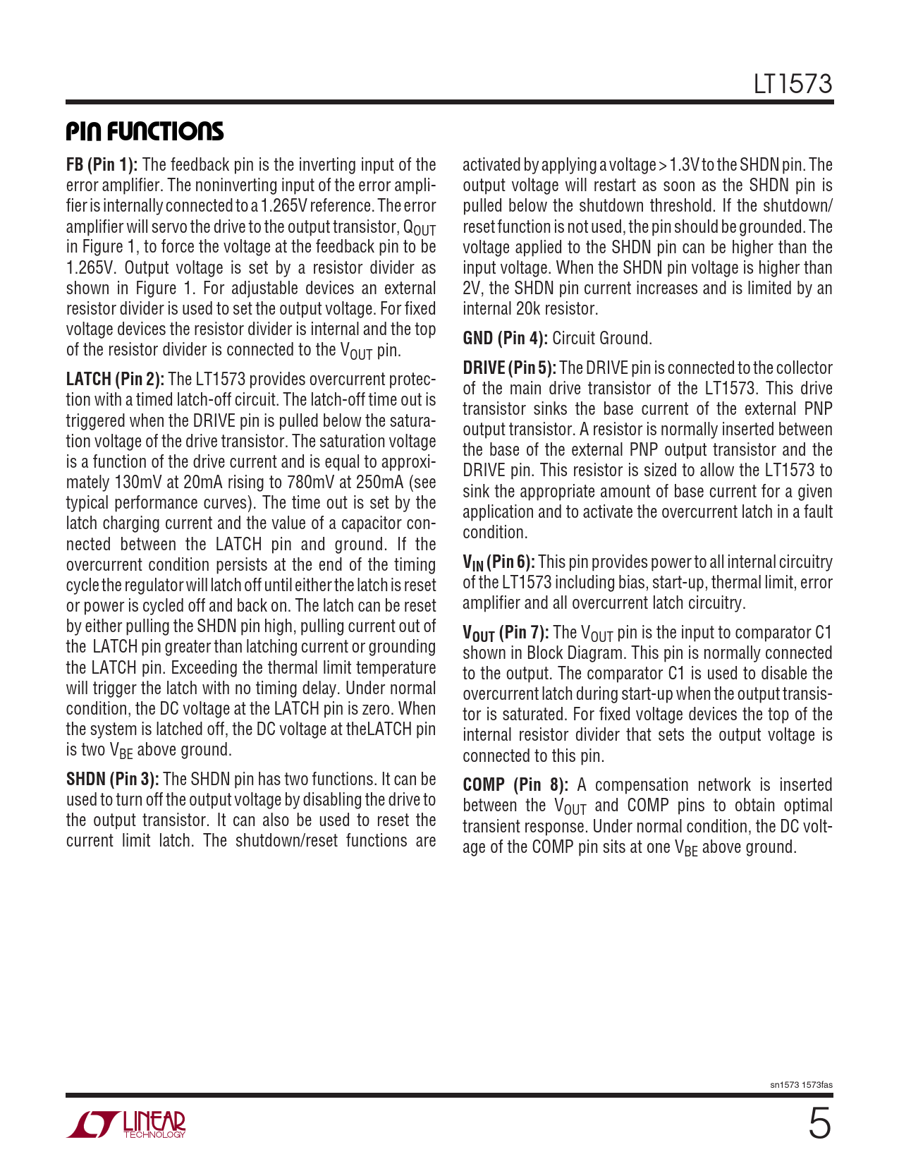 A compensation network is inserted used to turn off the output voltage by disabling the drive to between the VOUT and COMP pins to obtain optimal the output transistor. It can also be used to reset the transient response. Under normal condition, the DC volt- current limit latch. The shutdown/reset functions are age of the COMP pin sits at one VBE above ground. sn1573 1573fas 5
