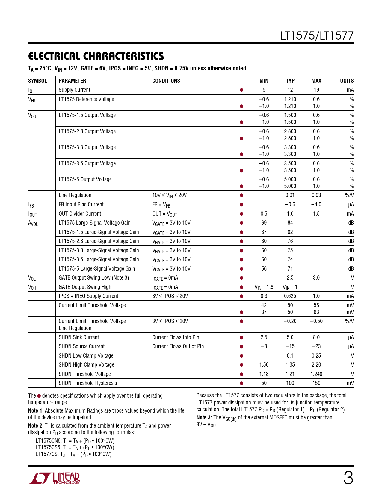 IQ Supply Current ● 5 12 19 mA VFB LT1575 Reference Voltage – 0.6 1.210 0.6 % ● – 1.0 1.210 1.0 % VOUT LT1575-1.5 Output Voltage – 0.6 1.500 0.6 % ● – 1.0 1.500 1.0 % LT1575-2.8 Output Voltage – 0.6 2.800 0.6 % ● – 1.0 2.800 1.0 % LT1575-3.3 Output Voltage – 0.6 3.300 0.6 % ● – 1.0 3.300 1.0 % LT1575-3.5 Output Voltage – 0.6 3.500 0.6 % ● – 1.0 3.500 1.0 % LT1575-5 Output Voltage – 0.6 5.000 0.6 % ● – 1.0 5.000 1.0 % Line Regulation 10V ≤ VIN ≤ 20V ● 0.01 0.03 %/V IFB FB Input Bias Current FB = VFB ● – 0.6 – 4.0 µA IOUT OUT Divider Current OUT = VOUT ● 0.5 1.0 1.5 mA AVOL LT1575 Large-Signal Voltage Gain VGATE = 3V to 10V ● 69 84 dB LT1575-1.5 Large-Signal Voltage Gain VGATE = 3V to 10V ● 67 82 dB LT1575-2.8 Large-Signal Voltage Gain VGATE = 3V to 10V ● 60 76 dB LT1575-3.3 Large-Signal Voltage Gain VGATE = 3V to 10V ● 60 75 dB LT1575-3.5 Large-Signal Voltage Gain VGATE = 3V to 10V ● 60 74 dB LT1575-5 Large-Signal Voltage Gain VGATE = 3V to 10V ● 56 71 dB VOL GATE Output Swing Low (Note 3) IGATE = 0mA ● 2.5 3.0 V VOH GATE Output Swing High IGATE = 0mA ● VIN – 1.6 VIN – 1 V IPOS + INEG Supply Current 3V ≤ IPOS ≤ 20V ● 0.3 0.625 1.0 mA Current Limit Threshold Voltage 42 50 58 mV ● 37 50 63 mV Current Limit Threshold Voltage 3V ≤ IPOS ≤ 20V ● – 0.20 – 0.50 %/V Line Regulation SHDN Sink Current Current Flows Into Pin ● 2.5 5.0 8.0 µA SHDN Source Current Current Flows Out of Pin ● – 8 – 15 – 23 µA SHDN Low Clamp Voltage ● 0.1 0.25 V SHDN High Clamp Voltage ● 1.50 1.85 2.20 V SHDN Threshold Voltage ● 1.18 1.21 1.240 V SHDN Threshold Hysteresis ● 50 100 150 mV The ● denotes specifications which apply over the full operating Because the LT1577 consists of two regulators in the package, the total temperature range. LT1577 power dissipation must be used for its junction temperature