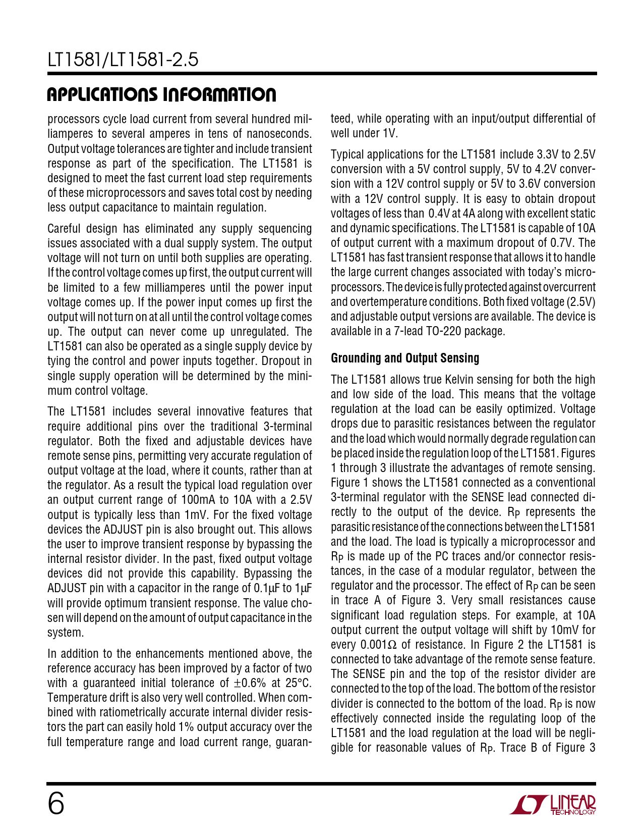LT1581/LT1581-2.5 UUWUAPPLICATIONS INFORMATION processors cycle load current from several hundred mil- teed, while operating with an input/output differential of liamperes to several amperes in tens of nanoseconds. well under 1V. Output voltage tolerances are tighter and include transient Typical applications for the LT1581 include 3.3V to 2.5V response as part of the specification. The LT1581 is conversion with a 5V control supply, 5V to 4.2V conver- designed to meet the fast current load step requirements sion with a 12V control supply or 5V to 3.6V conversion of these microprocessors and saves total cost by needing with a 12V control supply. It is easy to obtain dropout less output capacitance to maintain regulation. voltages of less than 0.4V at 4A along with excellent static Careful design has eliminated any supply sequencing and dynamic specifications. The LT1581 is capable of 10A issues associated with a dual supply system. The output of output current with a maximum dropout of 0.7V. The voltage will not turn on until both supplies are operating. LT1581 has fast transient response that allows it to handle If the control voltage comes up first, the output current will the large current changes associated with today’s micro- be limited to a few milliamperes until the power input processors. The device is fully protected against overcurrent voltage comes up. If the power input comes up first the and overtemperature conditions. Both fixed voltage (2.5V) output will not turn on at all until the control voltage comes and adjustable output versions are available. The device is up. The output can never come up unregulated. The available in a 7-lead TO-220 package. LT1581 can also be operated as a single supply device by tying the control and power inputs together. Dropout in Grounding and Output Sensing single supply operation will be determined by the mini- The LT1581 allows true Kelvin sensing for both the high mum control voltage. and low side of the load. This means that the voltage The LT1581 includes several innovative features that regulation at the load can be easily optimized. Voltage require additional pins over the traditional 3-terminal drops due to parasitic resistances between the regulator regulator. Both the fixed and adjustable devices have and the load which would normally degrade regulation can remote sense pins, permitting very accurate regulation of be placed inside the regulation loop of the LT1581. Figures output voltage at the load, where it counts, rather than at 1 through 3 illustrate the advantages of remote sensing. the regulator. As a result the typical load regulation over Figure 1 shows the LT1581 connected as a conventional an output current range of 100mA to 10A with a 2.5V 3-terminal regulator with the SENSE lead connected di- output is typically less than 1mV. For the fixed voltage rectly to the output of the device. RP represents the devices the ADJUST pin is also brought out. This allows parasitic resistance of the connections between the LT1581 the user to improve transient response by bypassing the and the load. The load is typically a microprocessor and internal resistor divider. In the past, fixed output voltage RP is made up of the PC traces and/or connector resis- devices did not provide this capability. Bypassing the tances, in the case of a modular regulator, between the ADJUST pin with a capacitor in the range of 0.1µF to 1µF regulator and the processor. The effect of RP can be seen will provide optimum transient response. The value cho- in trace A of Figure 3. Very small resistances cause sen will depend on the amount of output capacitance in the significant load regulation steps. For example, at 10A system. output current the output voltage will shift by 10mV for every 0.001Ω of resistance. In Figure 2 the LT1581 is In addition to the enhancements mentioned above, the connected to take advantage of the remote sense feature. reference accuracy has been improved by a factor of two The SENSE pin and the top of the resistor divider are with a guaranteed initial tolerance of ±0.6% at 25°C. connected to the top of the load. The bottom of the resistor Temperature drift is also very well controlled. When com- divider is connected to the bottom of the load. R bined with ratiometrically accurate internal divider resis- P is now effectively connected inside the regulating loop of the tors the part can easily hold 1% output accuracy over the LT1581 and the load regulation at the load will be negli- full temperature range and load current range, guaran- gible for reasonable values of RP. Trace B of Figure 3 6