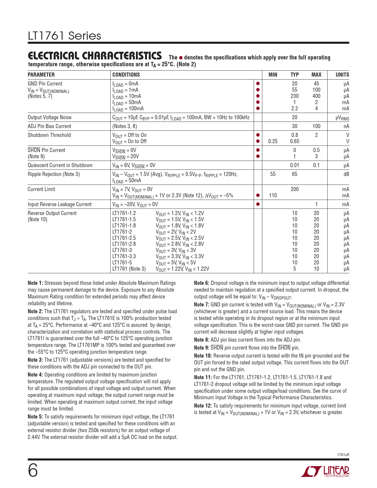 GND Pin Current ILOAD = 0mA l 20 45 μA VIN = VOUT(NOMINAL) ILOAD = 1mA l 55 100 μA (Notes 5, 7) ILOAD = 10mA l 230 400 μA ILOAD = 50mA l 1 2 mA ILOAD = 100mA l 2.2 4 mA Output Voltage Noise COUT = 10μF, CBYP = 0.01μF, ILOAD = 100mA, BW = 10Hz to 100kHz 20 μVRMS ADJ Pin Bias Current (Notes 3, 8) 30 100 nA Shutdown Threshold VOUT = Off to On l 0.8 2 V VOUT = On to Off l 0.25 0.65 V SHDN Pin Current VSHDN = 0V l 0 0.5 μA (Note 9) VSHDN = 20V l 1 3 μA Quiescent Current in Shutdown VIN = 6V, VSHDN = 0V 0.01 0.1 μA Ripple Rejection (Note 3) VIN – VOUT = 1.5V (Avg), VRIPPLE = 0.5VP-P , fRIPPLE = 120Hz, 55 65 dB ILOAD = 50mA Current Limit VIN = 7V, VOUT = 0V 200 mA VIN = VOUT(NOMINAL) + 1V or 2.3V (Note 12), ΔVOUT = –5% l 110 mA Input Reverse Leakage Current VIN = –20V, VOUT = 0V l 1 mA Reverse Output Current LT1761-1.2 VOUT = 1.2V, VIN < 1.2V 10 20 μA (Note 10) LT1761-1.5 VOUT = 1.5V, VIN < 1.5V 10 20 μA LT1761-1.8 VOUT = 1.8V, VIN < 1.8V 10 20 μA LT1761-2 VOUT = 2V, VIN < 2V 10 20 μA LT1761-2.5 VOUT = 2.5V, VIN < 2.5V 10 20 μA LT1761-2.8 VOUT = 2.8V, VIN < 2.8V 10 20 μA LT1761-3 VOUT = 3V, VIN < 3V 10 20 μA LT1761-3.3 VOUT = 3.3V, VIN < 3.3V 10 20 μA LT1761-5 VOUT = 5V, VIN < 5V 10 20 μA LT1761 (Note 3) VOUT = 1.22V, VIN < 1.22V 5 10 μA