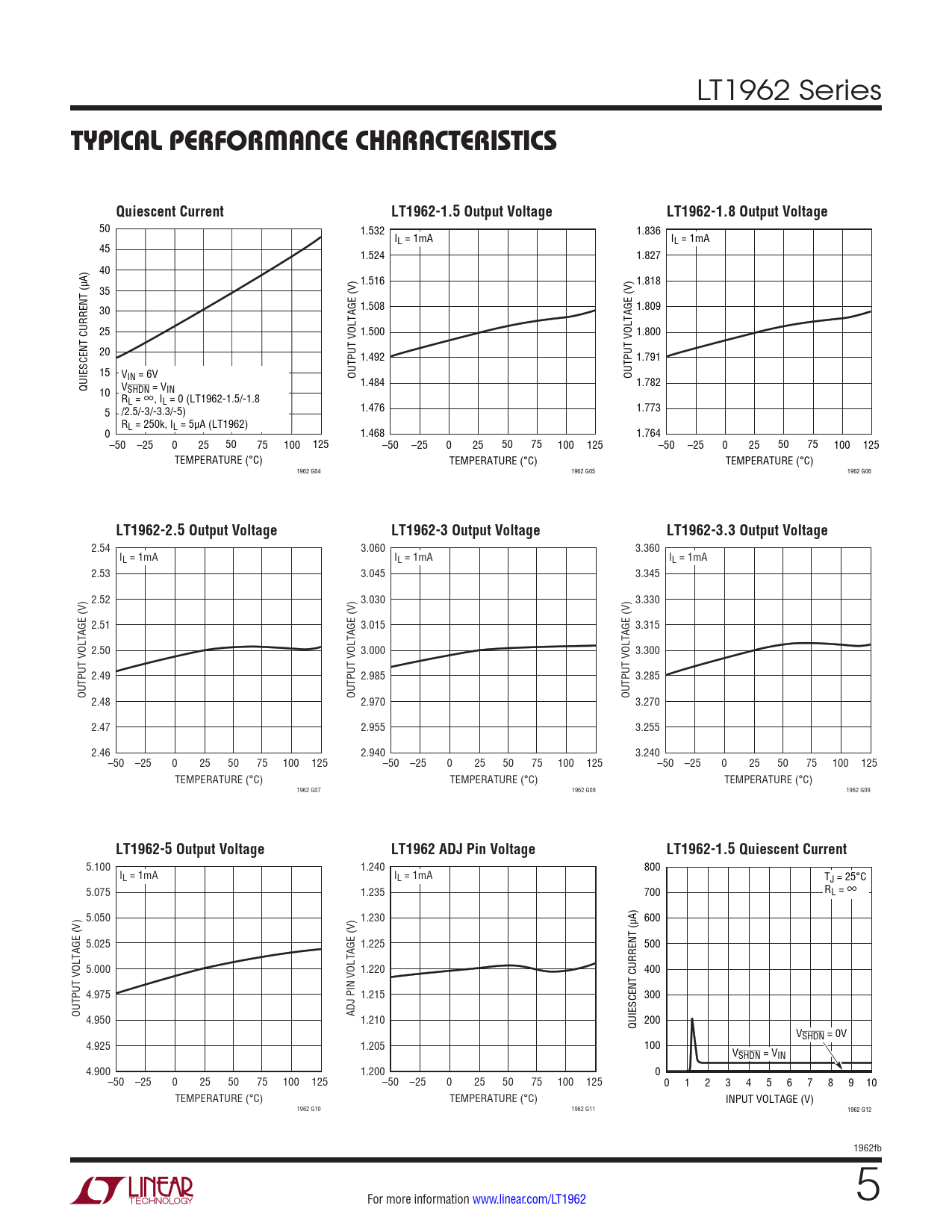 LT1962-5 Output Voltage LT1962 ADJ Pin Voltage LT1962-1.5 Quiescent Current