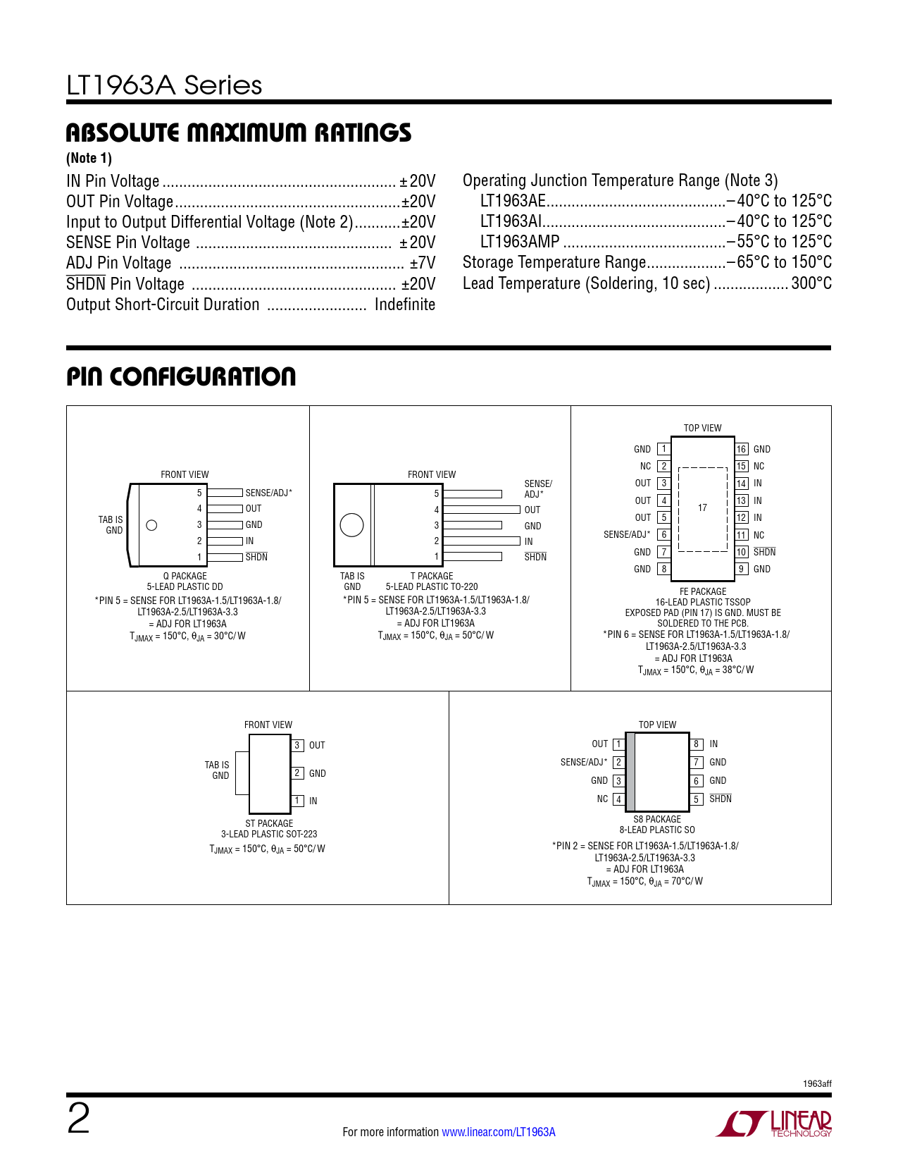 LT1963A Series absoluTe MaxiMuM raTings(Note 1) IN Pin Voltage .. ±20V Operating Junction Temperature Range (Note 3) OUT Pin Voltage ..±20V LT1963AE ...–40°C to 125°C Input to Output Differential Voltage (Note 2) ...±20V LT1963AI..–40°C to 125°C SENSE Pin Voltage ... ±20V LT1963AMP ...–55°C to 125°C ADJ Pin Voltage .. ±7V Storage Temperature Range ...–65°C to 150°C SHDN Pin Voltage ... ±20V Lead Temperature (Soldering, 10 sec) .. 300°C Output Short-Circuit Duration .. Indefinite pin conFiguraTion TOP VIEW GND 1 16 GND NC 2 15 NC FRONT VIEW FRONT VIEW SENSE/ OUT 3 14 IN 5 SENSE/ADJ* 5 ADJ* OUT 4 13 IN 4 OUT 4 OUT 17 TAB IS OUT 5 12 IN GND 3 GND 3 GND SENSE/ADJ* 6 11 NC 2 IN 2 IN 1 SHDN 1 SHDN GND 7 10 SHDN GND 8 9 GND Q PACKAGE TAB IS T PACKAGE 5-LEAD PLASTIC DD GND 5-LEAD PLASTIC TO-220 FE PACKAGE *PIN 5 = SENSE FOR LT1963A-1.5/LT1963A-1.8/ *PIN 5 = SENSE FOR LT1963A-1.5/LT1963A-1.8/ 16-LEAD PLASTIC TSSOP LT1963A-2.5/LT1963A-3.3 LT1963A-2.5/LT1963A-3.3 EXPOSED PAD (PIN 17) IS GND. MUST BE = ADJ FOR LT1963A = ADJ FOR LT1963A SOLDERED TO THE PCB. TJMAX = 150°C, θJA = 30°C/ W TJMAX = 150°C, θJA = 50°C/ W *PIN 6 = SENSE FOR LT1963A-1.5/LT1963A-1.8/ LT1963A-2.5/LT1963A-3.3 = ADJ FOR LT1963A TJMAX = 150°C, θJA = 38°C/ W FRONT VIEW TOP VIEW 3 OUT OUT 1 8 IN TAB IS SENSE/ADJ* 2 7 GND 2 GND GND GND 3 6 GND 1 IN NC 4 5 SHDN ST PACKAGE S8 PACKAGE 3-LEAD PLASTIC SOT-223 8-LEAD PLASTIC SO T *PIN 2 = SENSE FOR LT1963A-1.5/LT1963A-1.8/ JMAX = 150°C, θJA = 50°C/ W LT1963A-2.5/LT1963A-3.3 = ADJ FOR LT1963A TJMAX = 150°C, θJA = 70°C/ W 1963aff 2 For more information www.linear.com/LT1963A Document Outline Features Applications Description Typical Application Absolute Maximum Ratings Pin Configuration Order Information Electrical Characteristics Typical Performance Characteristics Pin Functions Applications Information Typical Applications Package Description Typical Application Revision History Related Parts