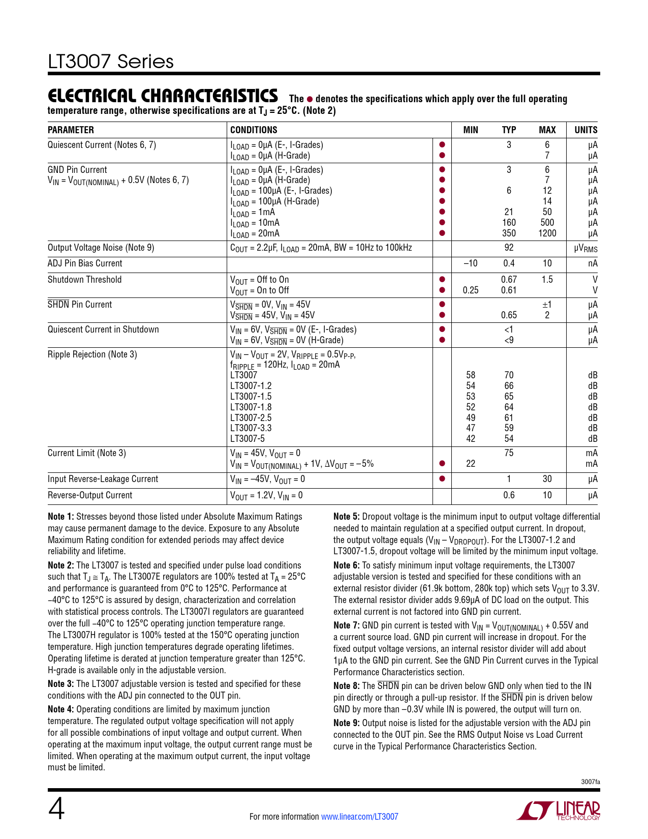 Quiescent Current (Notes 6, 7) ILOAD = 0µA (E-, I-Grades) l 3 6 µA ILOAD = 0µA (H-Grade) l 7 µA GND Pin Current ILOAD = 0µA (E-, I-Grades) l 3 6 µA VIN = VOUT(NOMINAL) + 0.5V (Notes 6, 7) ILOAD = 0µA (H-Grade) l 7 µA ILOAD = 100µA (E-, I-Grades) l 6 12 µA ILOAD = 100µA (H-Grade) l 14 µA ILOAD = 1mA l 21 50 µA ILOAD = 10mA l 160 500 µA ILOAD = 20mA l 350 1200 µA Output Voltage Noise (Note 9) COUT = 2.2µF, ILOAD = 20mA, BW = 10Hz to 100kHz 92 µVRMS ADJ Pin Bias Current –10 0.4 10 nA Shutdown Threshold VOUT = Off to On l 0.67 1.5 V VOUT = On to Off l 0.25 0.61 V SHDN Pin Current VSHDN = 0V, VIN = 45V l ±1 µA VSHDN = 45V, VIN = 45V l 0.65 2 µA Quiescent Current in Shutdown VIN = 6V, VSHDN = 0V (E-, I-Grades) l <1 µA VIN = 6V, VSHDN = 0V (H-Grade) l <9 µA Ripple Rejection (Note 3) VIN – VOUT = 2V, VRIPPLE = 0.5VP-P, fRIPPLE = 120Hz, ILOAD = 20mA LT3007 58 70 dB LT3007-1.2 54 66 dB LT3007-1.5 53 65 dB LT3007-1.8 52 64 dB LT3007-2.5 49 61 dB LT3007-3.3 47 59 dB LT3007-5 42 54 dB Current Limit (Note 3) VIN = 45V, VOUT = 0 75 mA VIN = VOUT(NOMINAL) + 1V, ∆VOUT = –5% l 22 mA Input Reverse-Leakage Current VIN = –45V, VOUT = 0 l 1 30 µA Reverse-Output Current VOUT = 1.2V, VIN = 0 0.6 10 µA