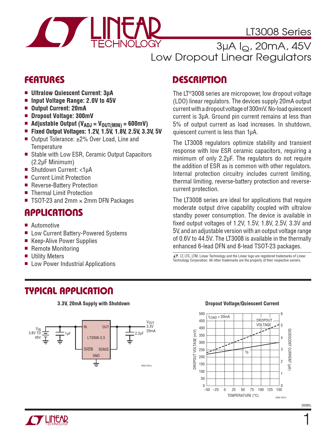 LT3008 Series 3µA IQ, 20mA, 45V Low Dropout Linear Regulators