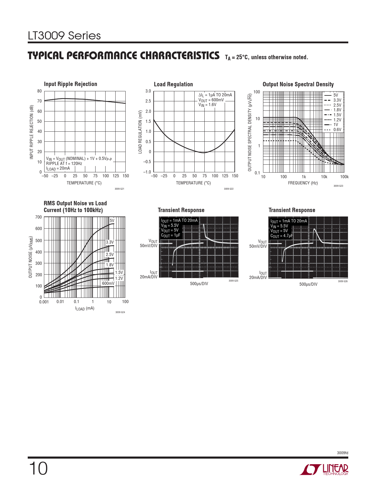 80 3.0 100 ΔI ) L = 1μA TO 20mA Hz 5V 70 2.5 VOUT = 600mV 3.3V VIN = 1.6V 2.5V 60 2.0 1.8V 1.5V 10 50 1.5 1.2V 1V 40 1.0 0.6V 30 0.5 1 20 LOAD REGULATION (mV) 0 INPUT RIPPLE REJECTION (dB) VIN = VOUT (NOMINAL) + 1V + 0.5VP-P 10 –0.5 RIPPLE AT f = 120Hz ILOAD = 20mA OUTPUT NOISE SPECTRAL DENSITY (μV√ 0 –1.0 0.1 –50 –25 0 25 50 75 100 125 150 –50 –25 0 25 50 75 100 125 150 10 100 1k 10k 100k TEMPERATURE (°C) TEMPERATURE (°C) FREQUENCY (Hz) 3009 G23 3009 G21 3009 G22