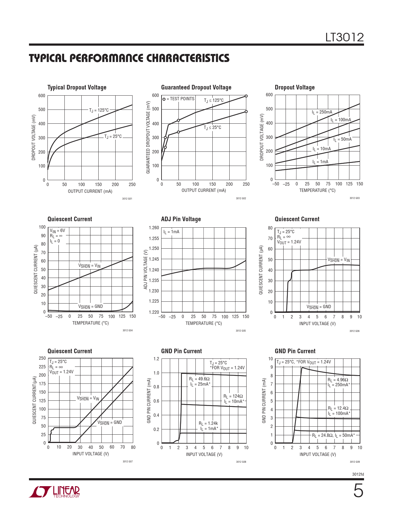 600 600 600 = TEST POINTS TJ ≤ 125°C 500 T 500 500 J = 125°C IL = 250mA TAGE (mV) IL = 100mA 400 400 400 TJ ≤ 25°C TAGE (mV) 300 TJ = 25°C 300 300 IL = 50mA I 200 200 200 L = 10mA DROPOUT VOL DROPOUT VOLTAGE (mV) IL = 1mA 100 100 100 GUARANTEED DROPOUT VOL 0 0 0 0 50 100 150 200 250 0 50 100 150 200 250 –50 –25 0 25 50 75 100 125 150 OUTPUT CURRENT (mA) OUTPUT CURRENT (mA) TEMPERATURE (°C) 3012 G01 3012 G02 3012 G03