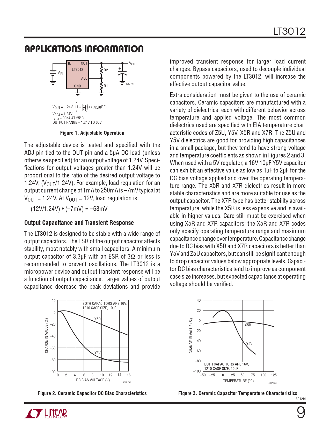 LT3012 APPLICATIONS INFORMATION IN OUT V improved transient response for larger load current OUT LT3012 + R2 changes. Bypass capacitors, used to decouple individual VIN ADJ components powered by the LT3012, will increase the 3012 F01 GND R1 effective output capacitor value. Extra consideration must be given to the use of ceramic capacitors. Ceramic capacitors are manufactured with a R2 VOUT = 1.24V 1 + + (IADJ)(R2) R1 variety of dielectrics, each with different behavior across VADJ = 1.24V IADJ = 30nA AT 25°C temperature and applied voltage. The most common OUTPUT RANGE = 1.24V TO 60V dielectrics used are specifi ed with EIA temperature char- Figure 1. Adjustable Operation acteristic codes of Z5U, Y5V, X5R and X7R. The Z5U and Y5V dielectrics are good for providing high capacitances The adjustable device is tested and specifi ed with the in a small package, but they tend to have strong voltage ADJ pin tied to the OUT pin and a 5μA DC load (unless and temperature coeffi cients as shown in Figures 2 and 3. otherwise specifi ed) for an output voltage of 1.24V. Speci- When used with a 5V regulator, a 16V 10μF Y5V capacitor fi cations for output voltages greater than 1.24V will be can exhibit an effective value as low as 1μF to 2μF for the proportional to the ratio of the desired output voltage to DC bias voltage applied and over the operating tempera- 1.24V; (VOUT/1.24V). For example, load regulation for an ture range. The X5R and X7R dielectrics result in more output current change of 1mA to 250mA is –7mV typical at stable characteristics and are more suitable for use as the VOUT = 1.24V. At VOUT = 12V, load regulation is: output capacitor. The X7R type has better stability across (12V/1.24V) • (–7mV) = –68mV temperature, while the X5R is less expensive and is avail- able in higher values. Care still must be exercised when Output Capacitance and Transient Response using X5R and X7R capacitors; the X5R and X7R codes The LT3012 is designed to be stable with a wide range of only specify operating temperature range and maximum output capacitors. The ESR of the output capacitor affects capacitance change over temperature. Capacitance change stability, most notably with small capacitors. A minimum due to DC bias with X5R and X7R capacitors is better than output capacitor of 3.3μF with an ESR of 3Ω or less is Y5V and Z5U capacitors, but can still be signifi cant enough recommended to prevent oscillations. The LT3012 is a to drop capacitor values below appropriate levels. Capaci- micropower device and output transient response will be tor DC bias characteristics tend to improve as component a function of output capacitance. Larger values of output case size increases, but expected capacitance at operating capacitance decrease the peak deviations and provide voltage should be verifi ed. 20 40 BOTH CAPACITORS ARE 16V, 1210 CASE SIZE, 10μF 20 0 X5R 0 –20 X5R –20 –40 –40 Y5V –60 CHANGE IN VALUE (%) Y5V –60 CHANGE IN VALUE (%) –80 –80 BOTH CAPACITORS ARE 16V, 1210 CASE SIZE, 10μF –100 –100 0 2 4 6 8 10 12 14 16 –50 –25 0 25 50 75 100 125 DC BIAS VOLTAGE (V) TEMPERATURE (°C) 3012 F02 3012 F03 Figure 2. Ceramic Capacitor DC Bias CharacteristicsFigure 3. Ceramic Capacitor Temperature Characteristics 3012fd 9