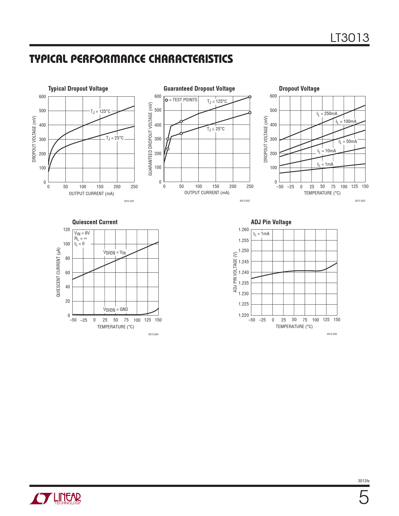 120 1.260 VIN = 6V IL = 1mA RL = ∞ 1.255 100 IL = 0 VSHDN = V 1.250 IN 80 1.245 60 1.240 1.235 40 ADJ PIN VOLTAGE (V) QUIESCENT CURRENT (μA) 1.230 20 1.225 VSHDN = GND 0 1.220 –50 –25 0 25 50 75 100 125 150 –50 –25 0 25 50 75 100 125 150 TEMPERATURE (°C) TEMPERATURE (°C) 3013 G04 3013 G05 3013fe 5